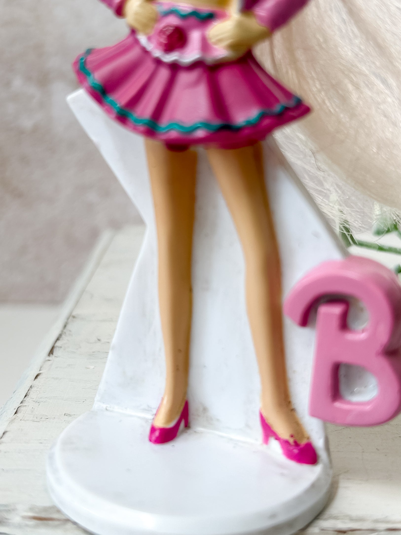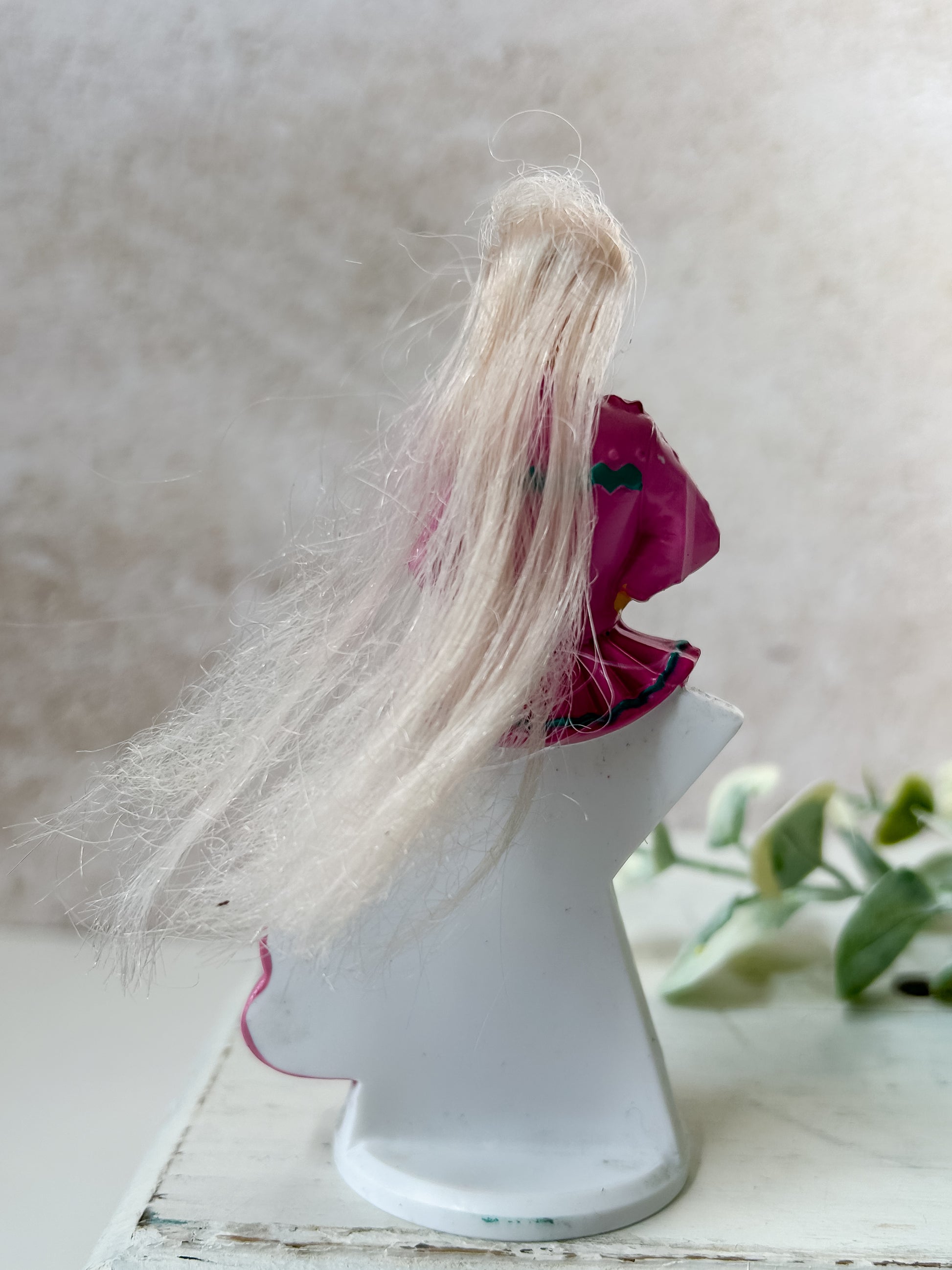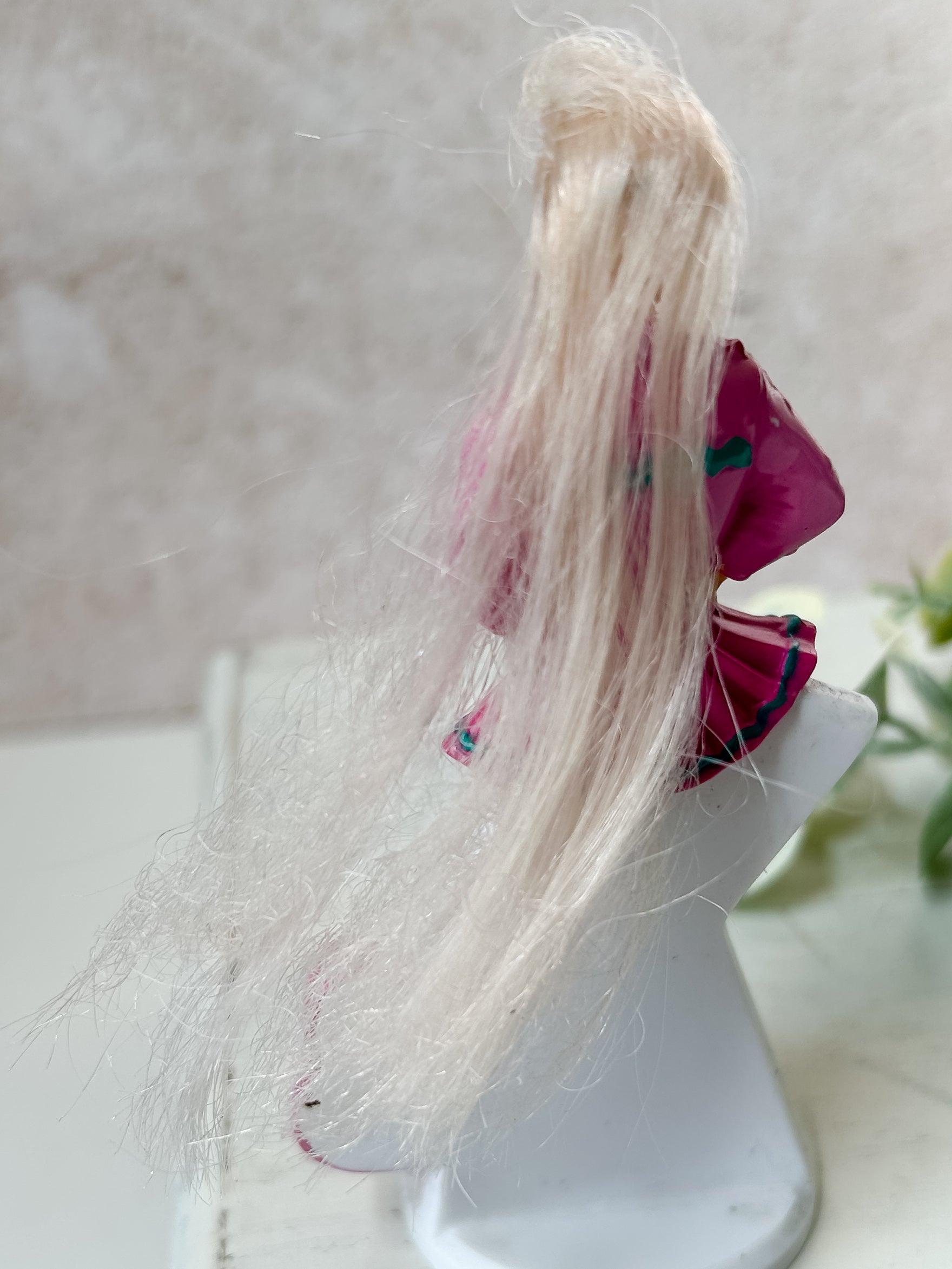 From 1993, McDonald's Happy Meal Barbie "Paint 'n Dazzle." She is in good, used condition, with a clean face and outfit. Her hair is frizzy and frayed at the end, and she has some dirt residue on her base. Stands 4.5" tall. Packaging not included.