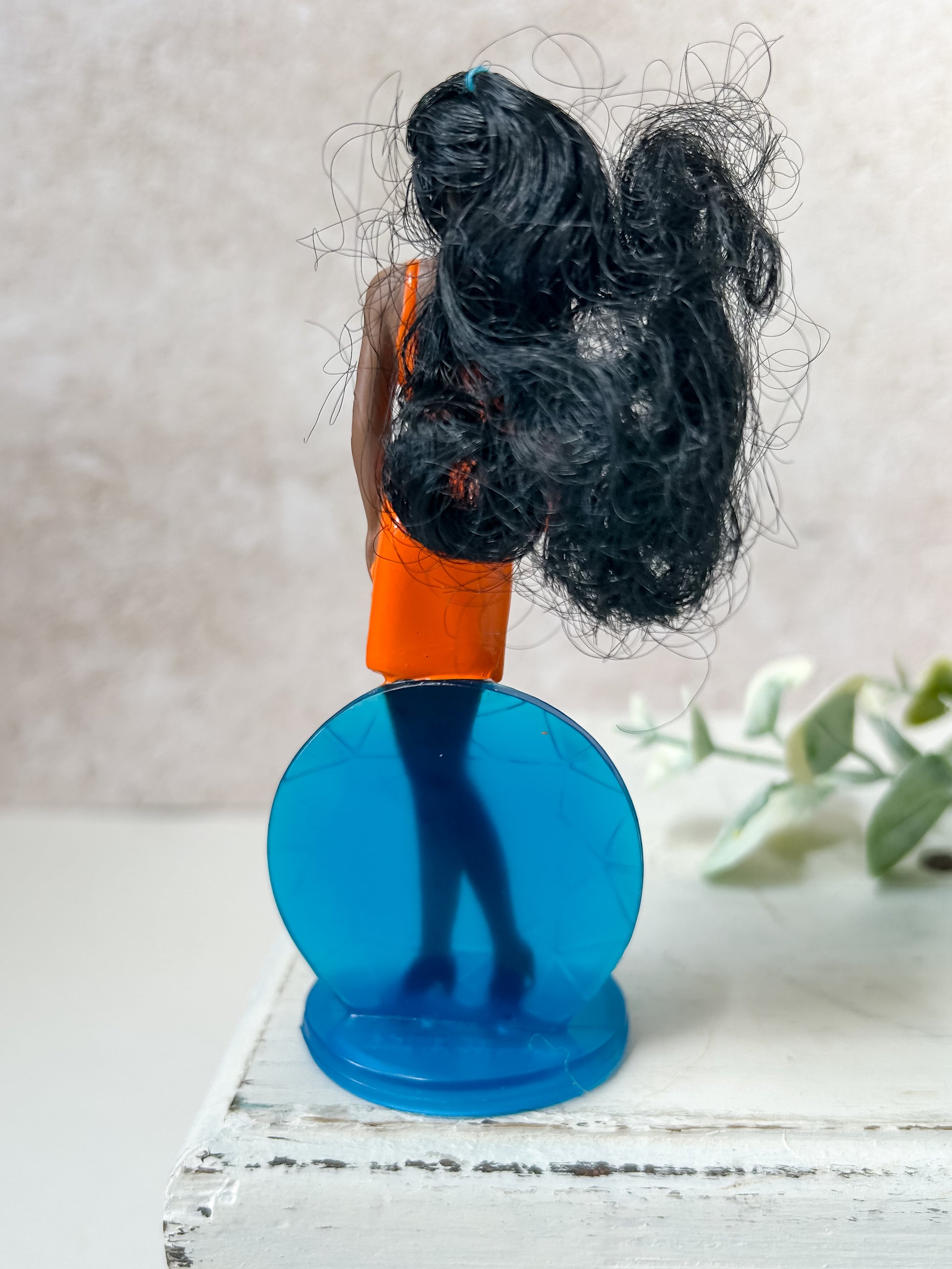 From 1994, McDonald's Happy Meal Barbie "Shani." She is in good, used condition, face and dress is clean. Her hair is a bit fuzzy. Stands 4.75" tall.