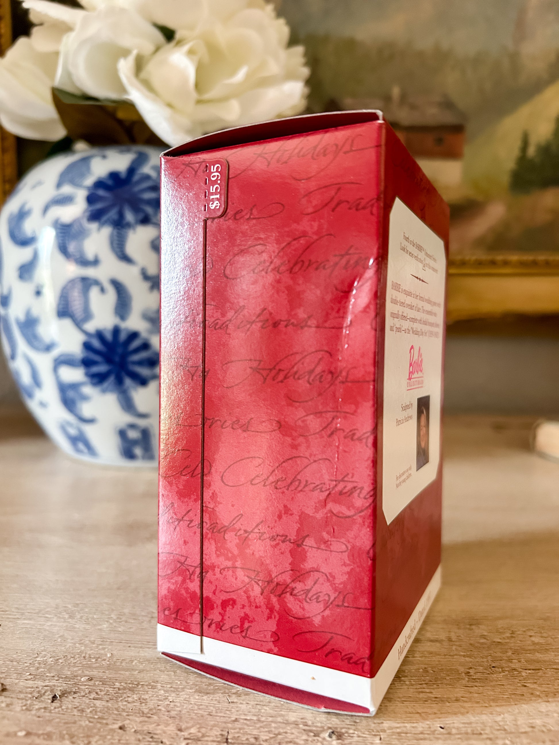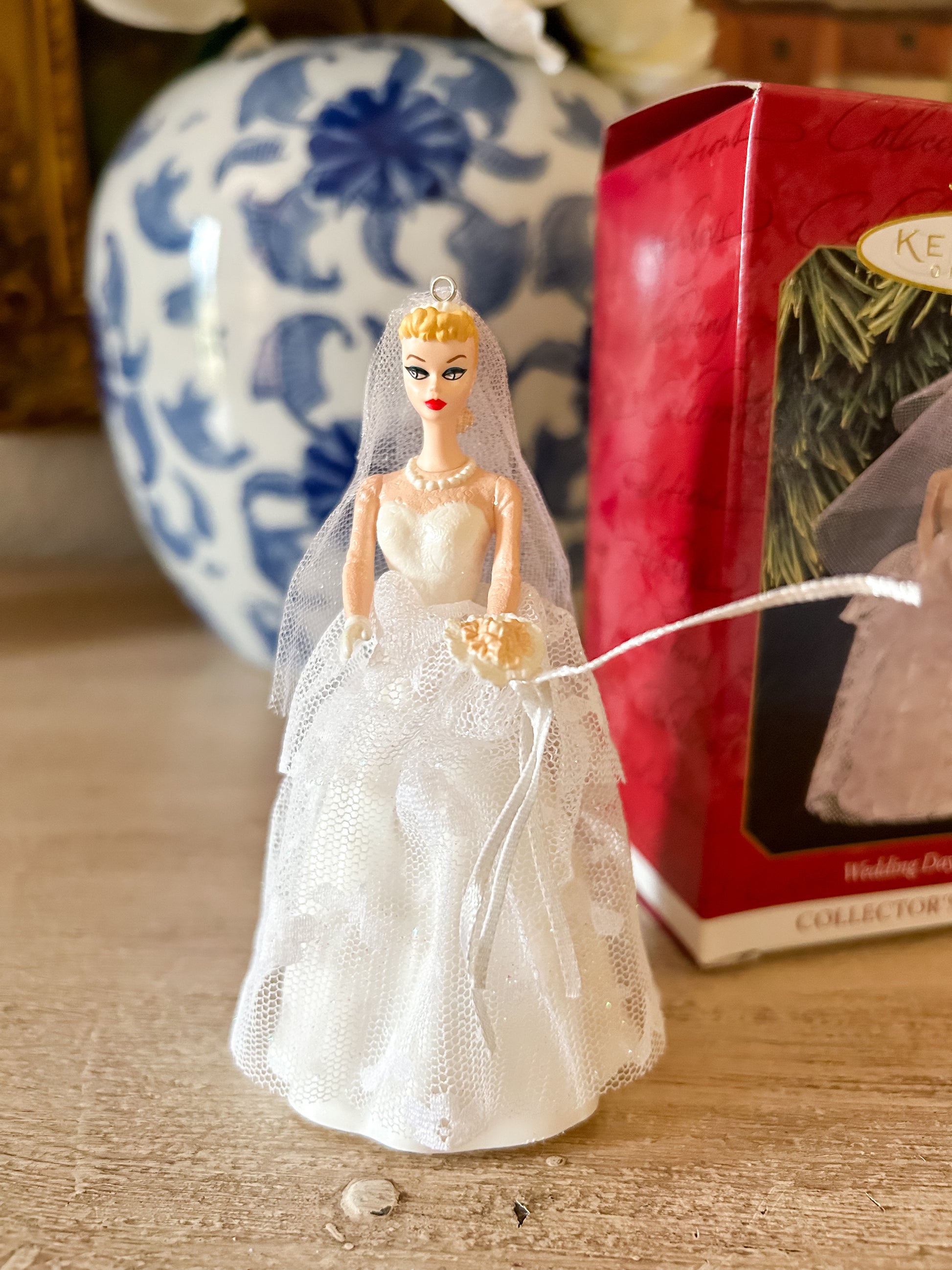 Vintage Wedding Barbie ornament, from the Collector Series, Hallmark Keepsake Ornament from 1997. Complete with its original box and all packaging. The ornament and box are in very good condition. One ribbon on Barbie's bouquet is bent upwards from storage, but can be reshaped to lie flat with a little steam and proper packaging in restorage.