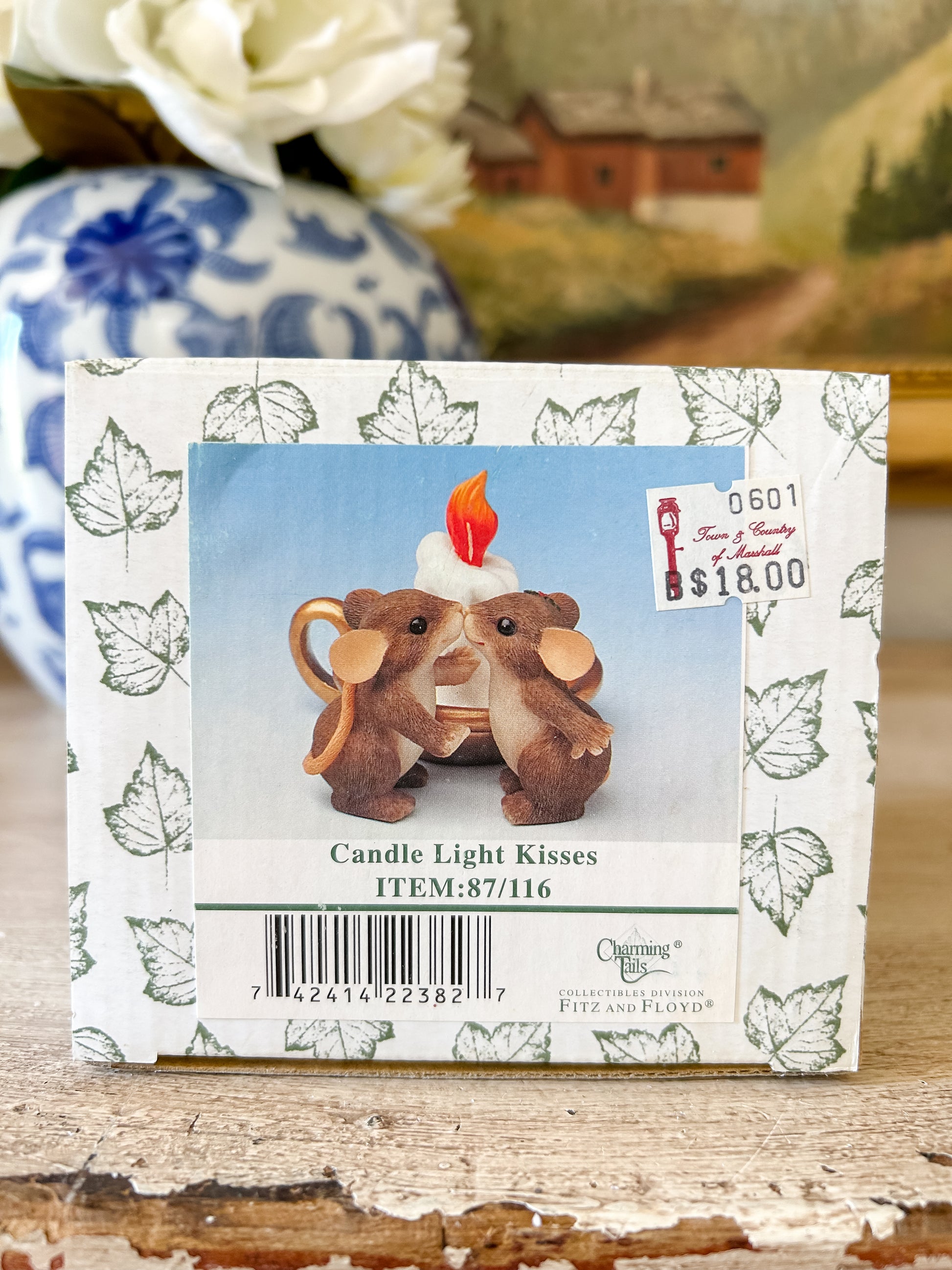 This figurine is Candle Light Kisses 87/116, featuring two mice stealing a Christmas kiss by a candle.