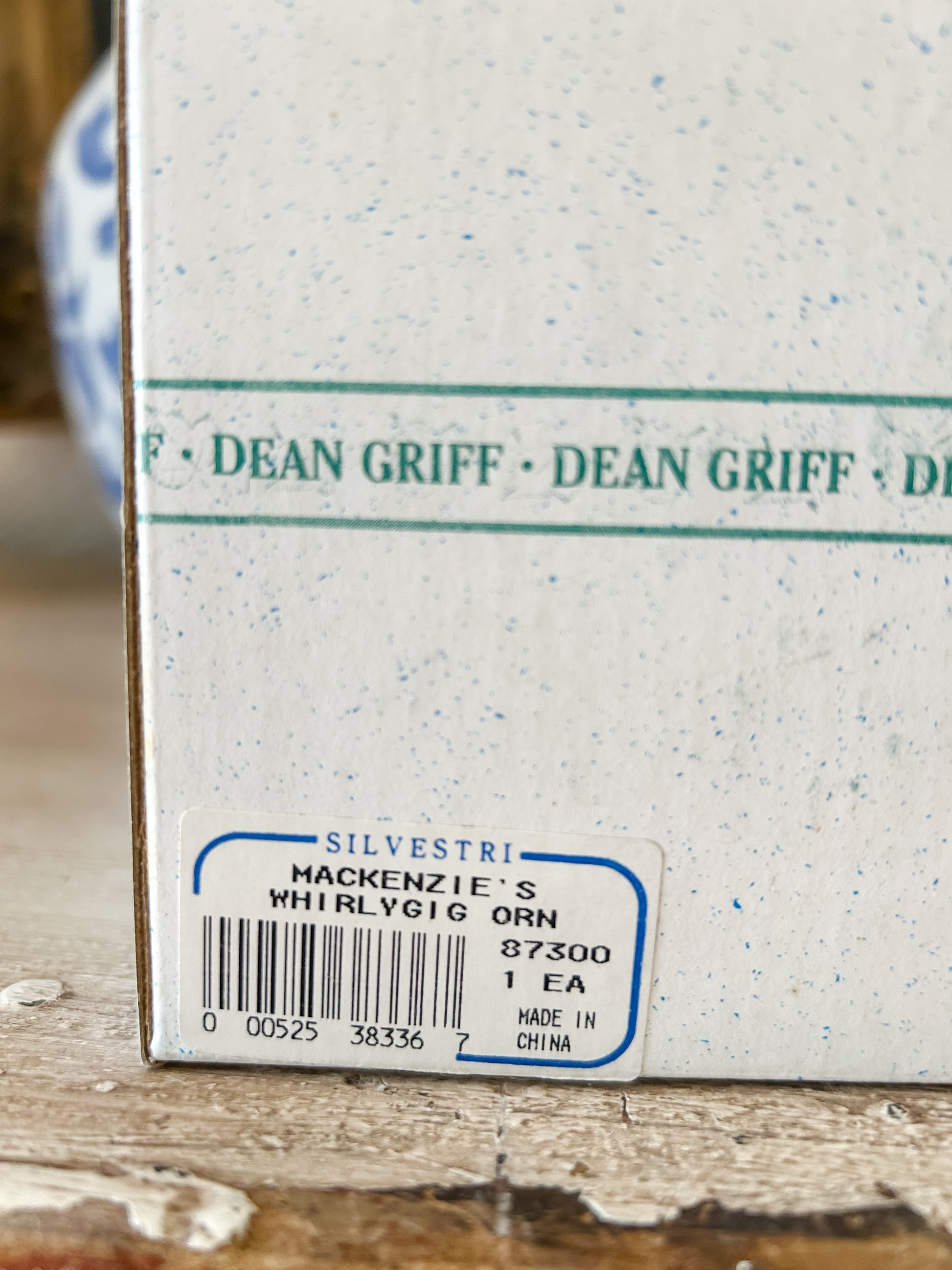 This figurine is Mackenzie's Whirlygig 87300. Please note this was originally an ornament, and the top propeller piece has broken off. The previous owner replaced it with a bow. So now it's a standing figurine.