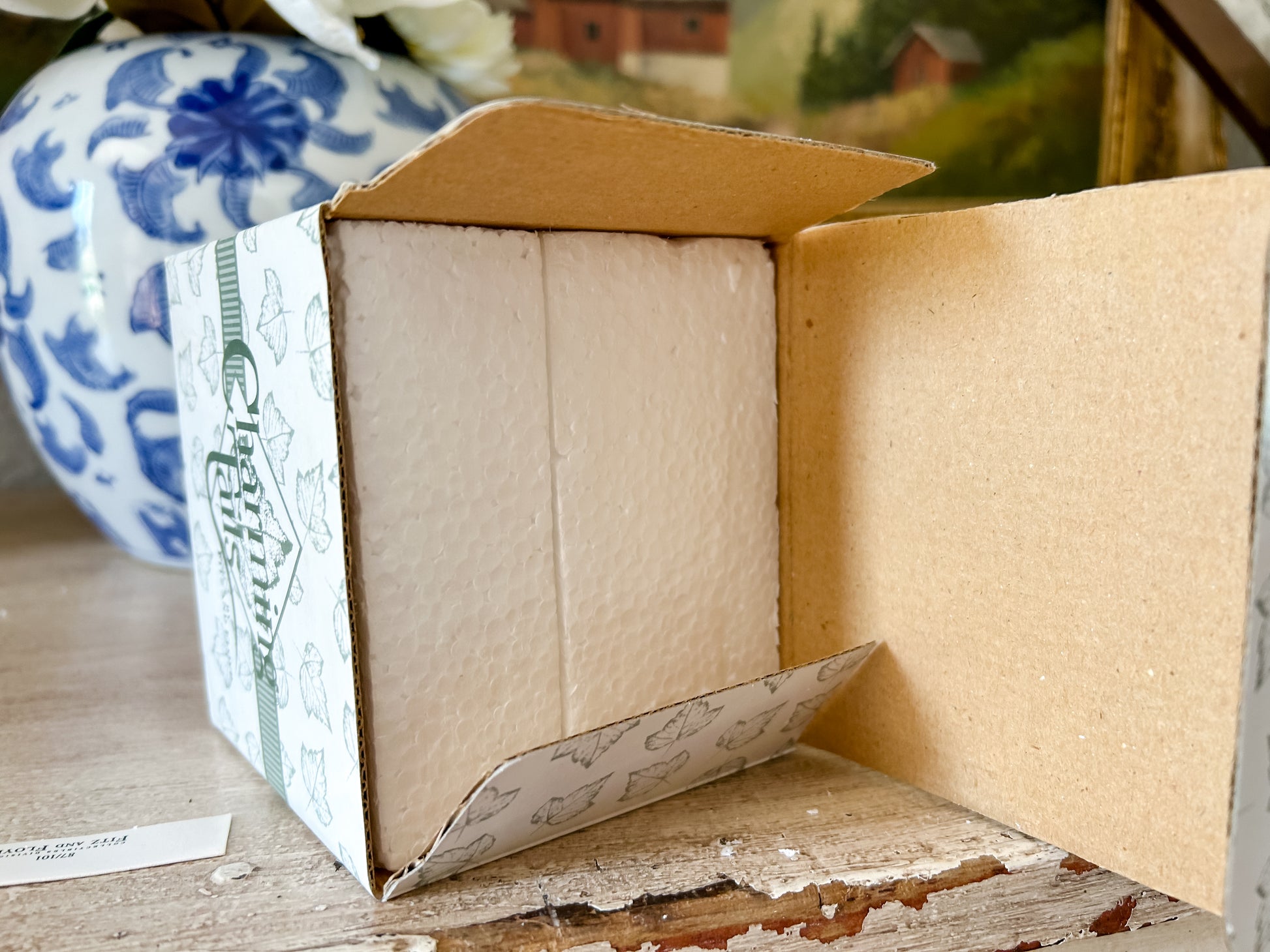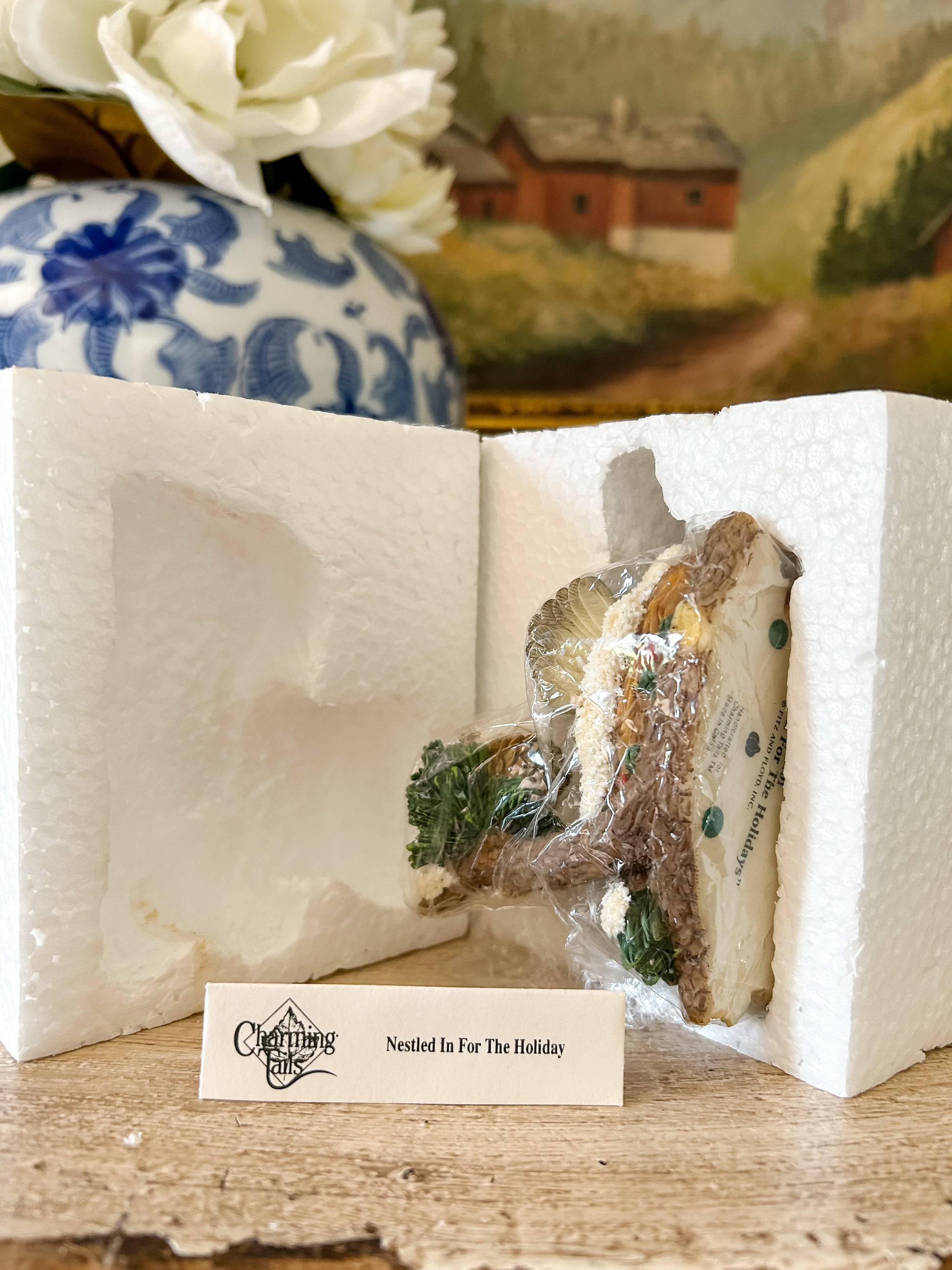This figurine is Nestled In For the Holidays, 87/101. The original box is included, along with the styrofoam packaging and plastic wrap. The box may show some wear and have extra stickers on it. The figurine is in good condition with no chips or breaks.