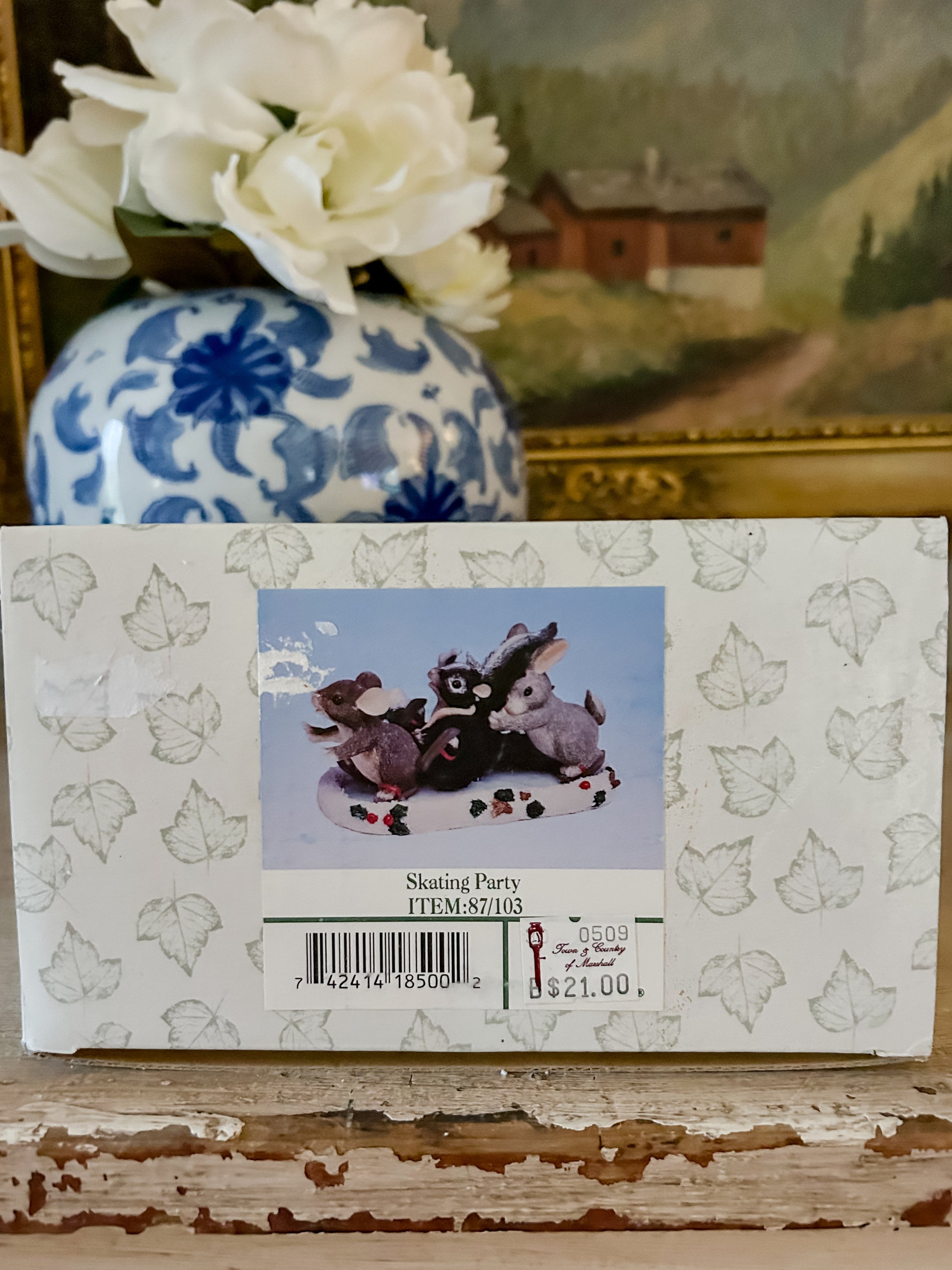 This figurine is Skating Party 87/103 and features Mackenzie Mouse, Stewart Skunk, and Binky Rabbit ice skating on a snowy pond.