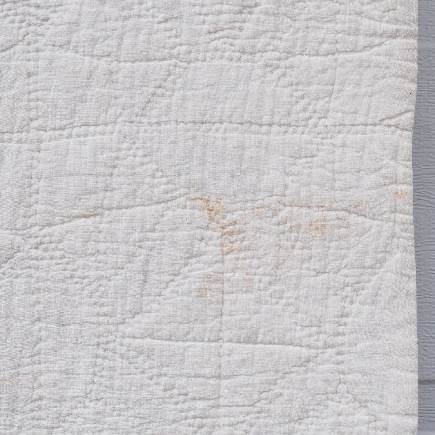 When found, the quilt had a few substantial stains on the front. It was stain-treated and soaked, and the stains have lessened greatly. However faint outlines can still be seen, and those are shown in the photos.