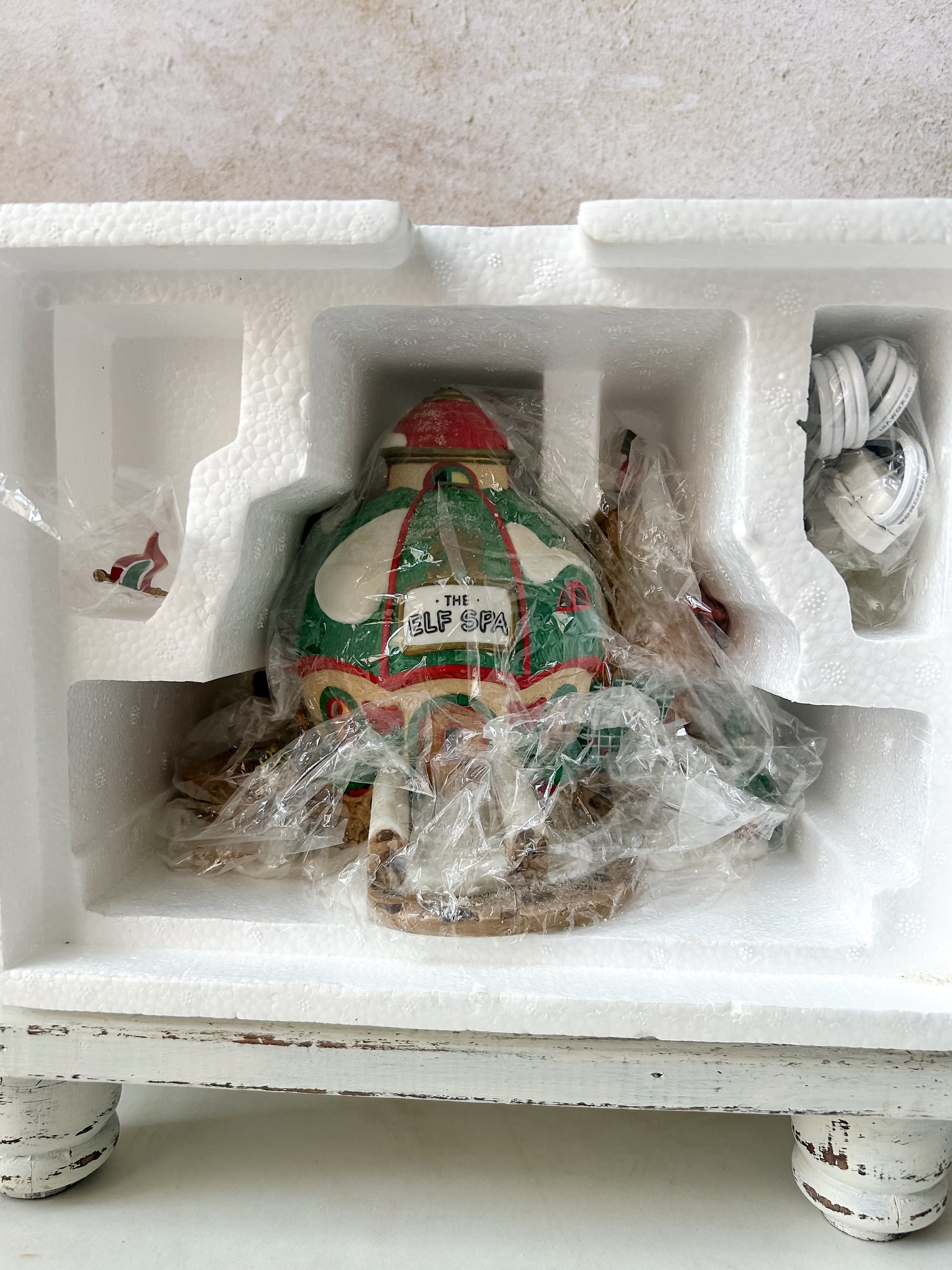 Start or add to your charming Christmas village with this retired design from Department 56. This is the "The Elf Spa" #56402, from the North Pole series. It was released in 1998 and retired in 2001.