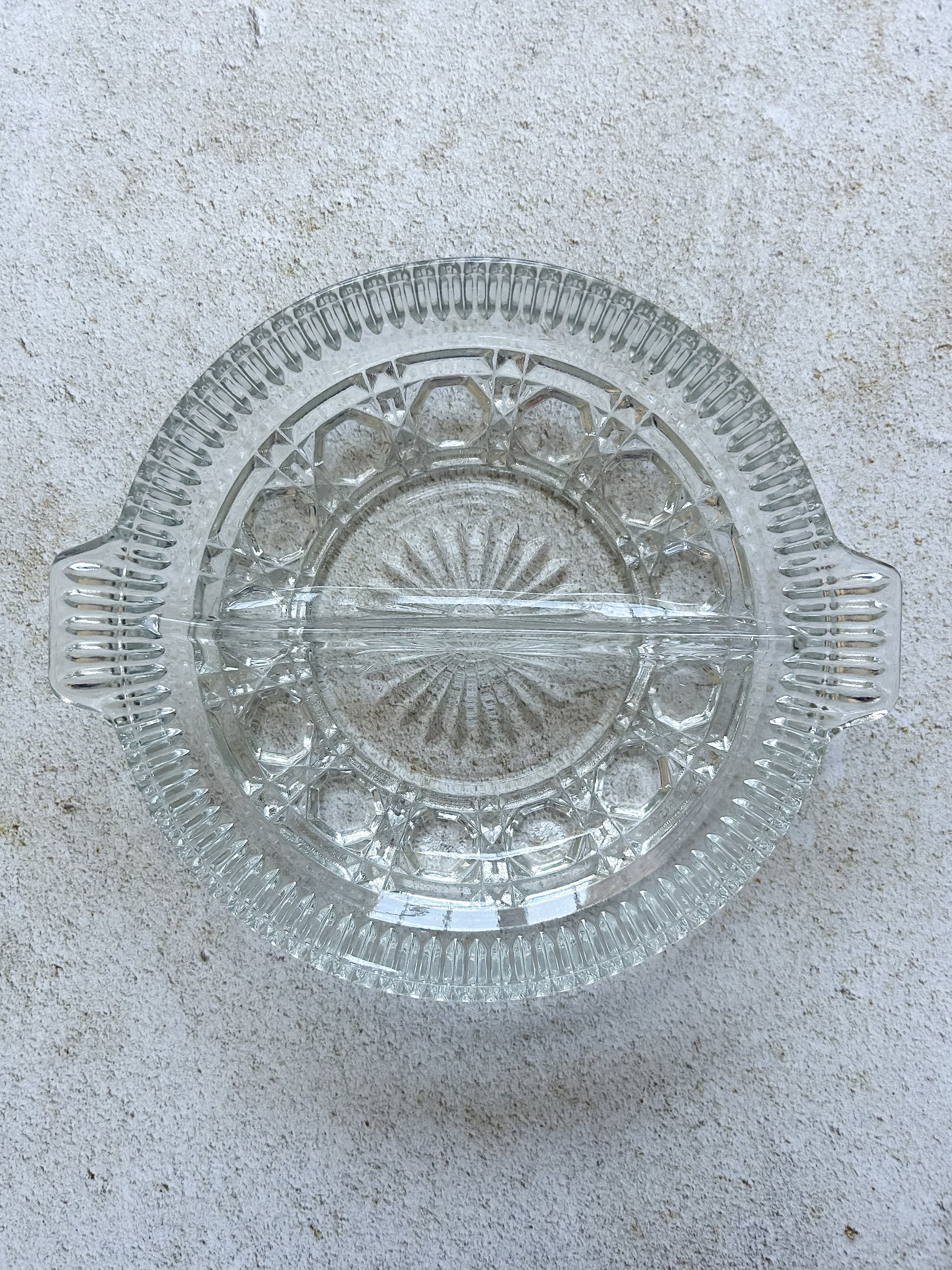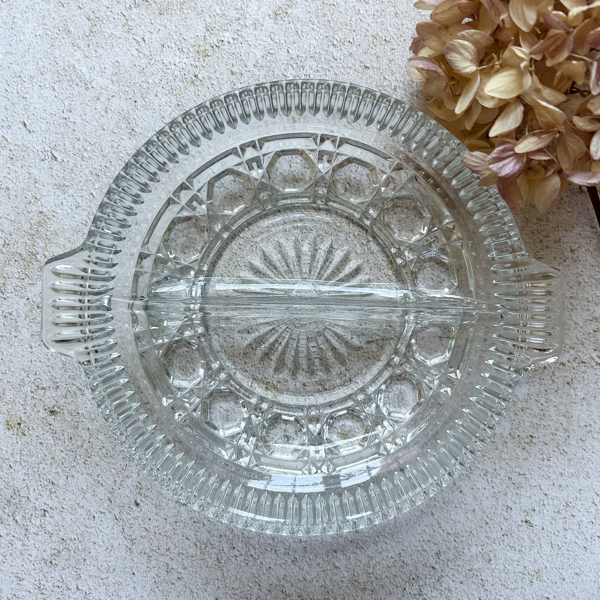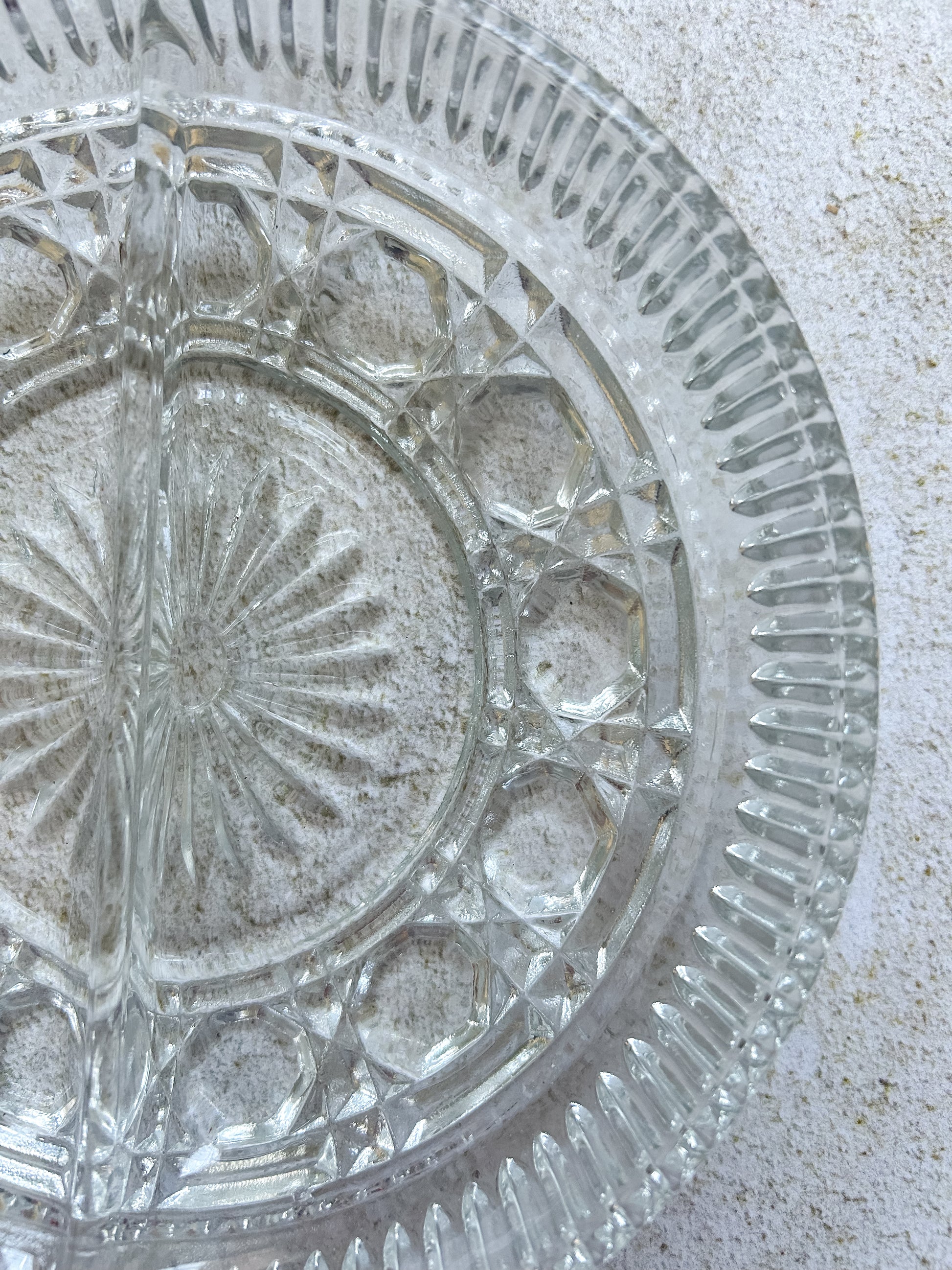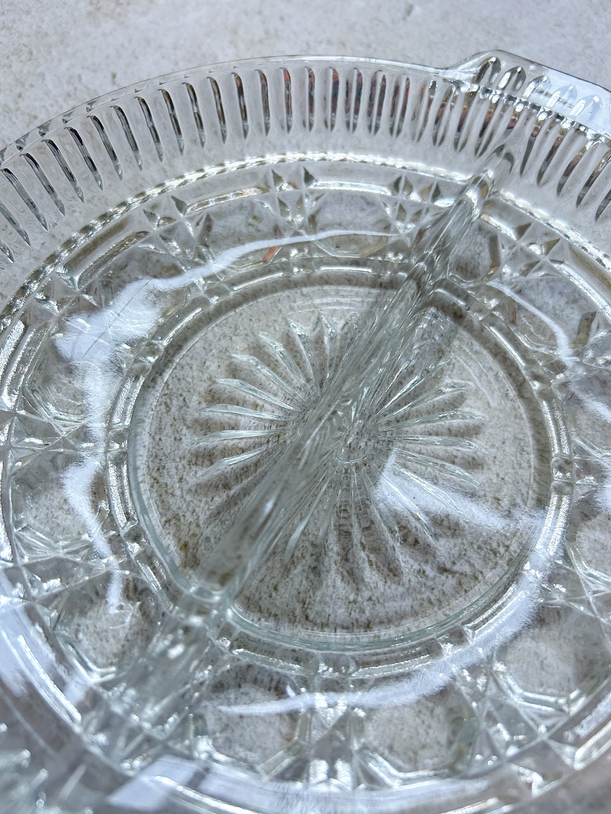 A beautiful, heavy glass vintage divided relish tray. Free of any chips or cracks, approximately 7.25" in diameter.