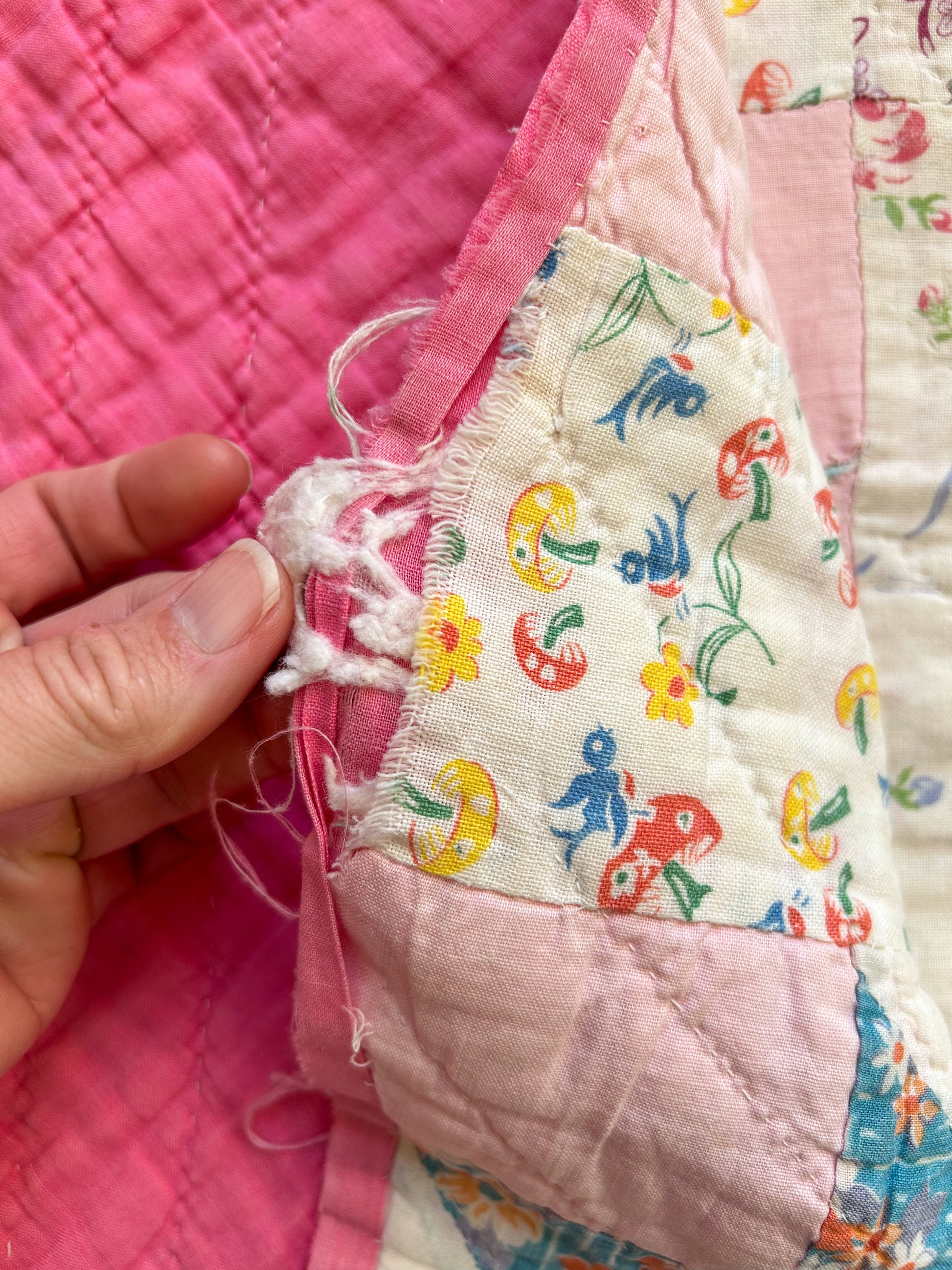 This quilt is full of adorable vintage feedsack and novelty print fabrics, with a bright pink backing and lighter pink accents. It's the Ohio Star pattern and appears to be both hand-pieced and hand-stitched.