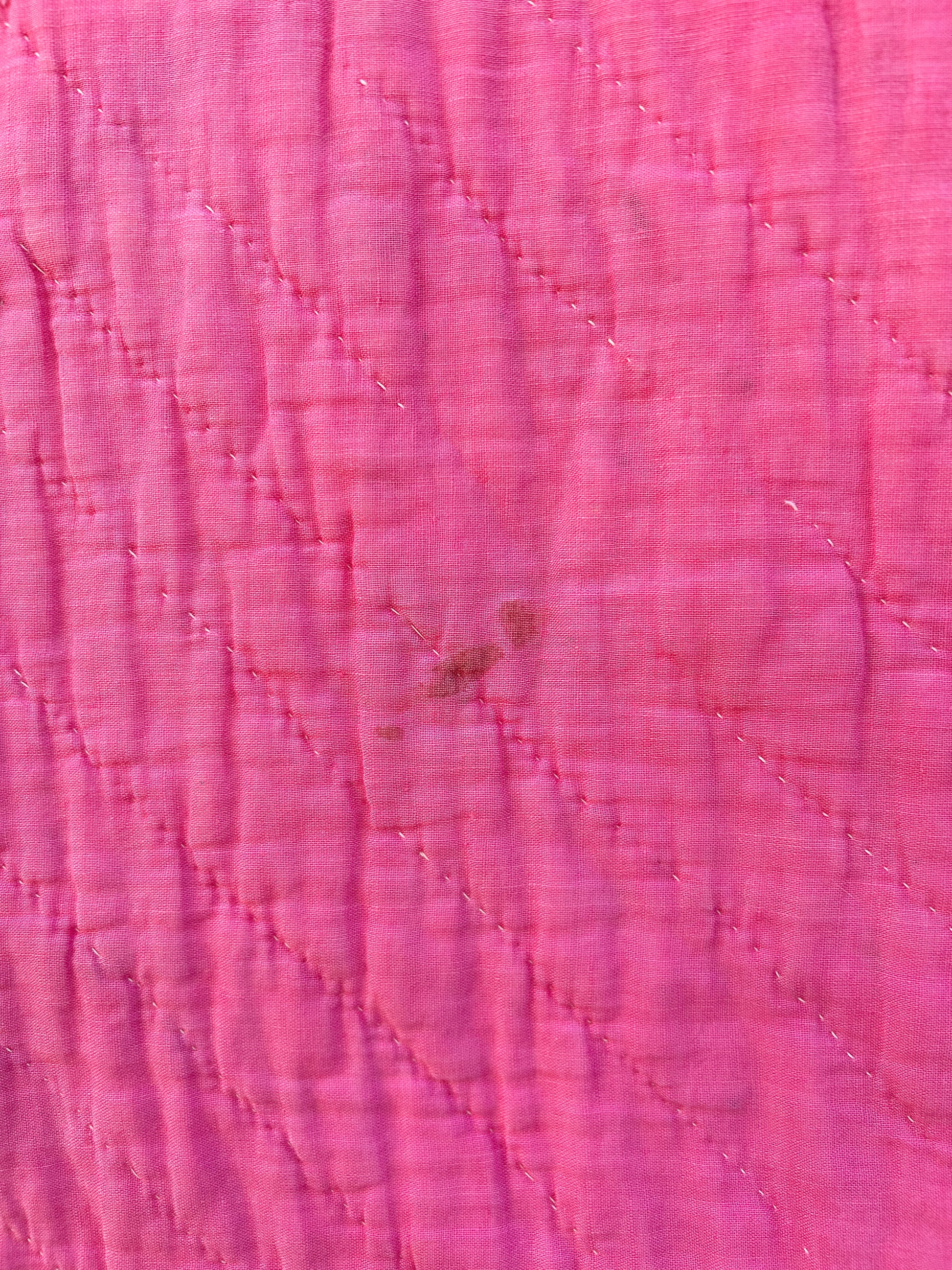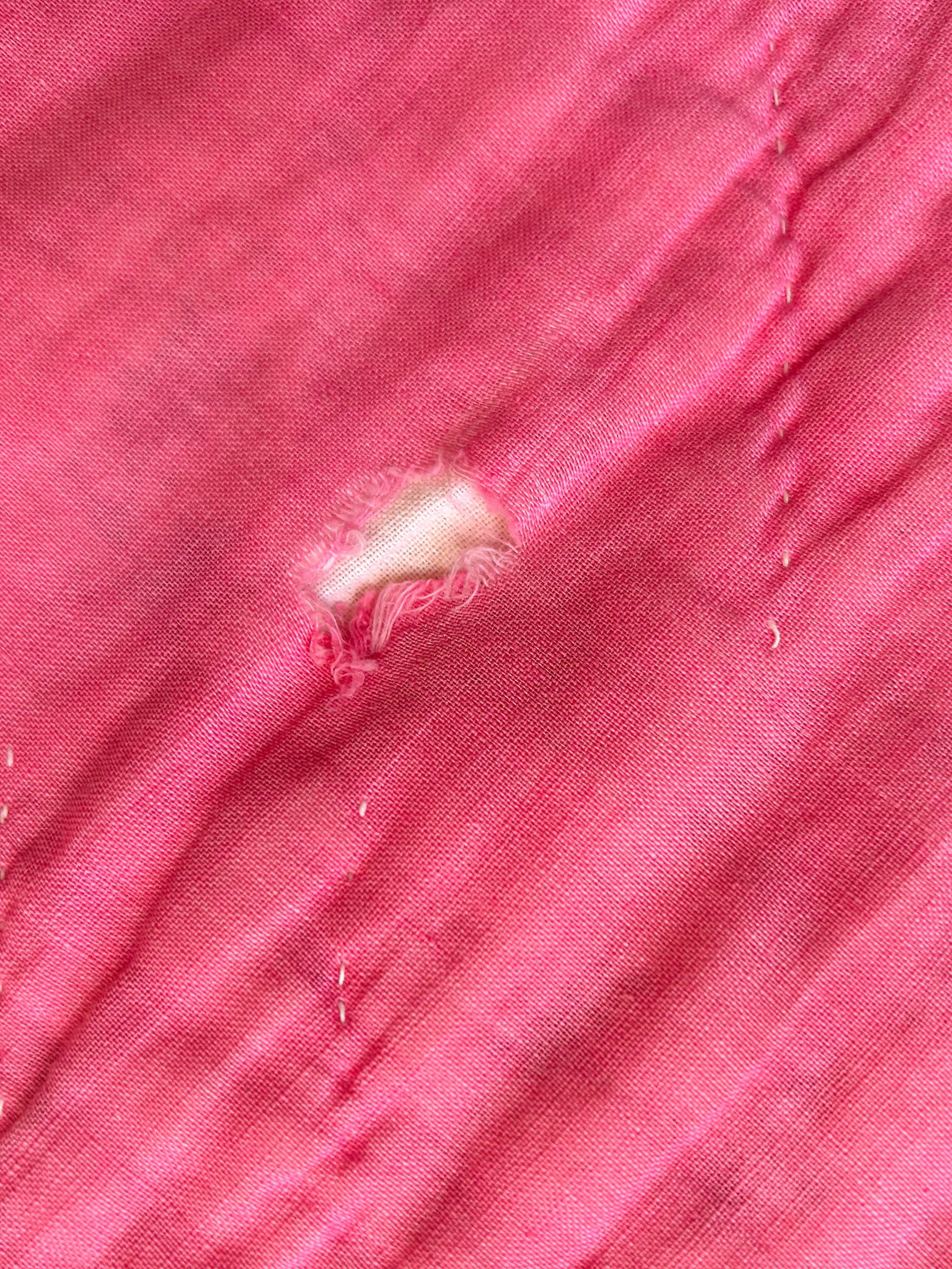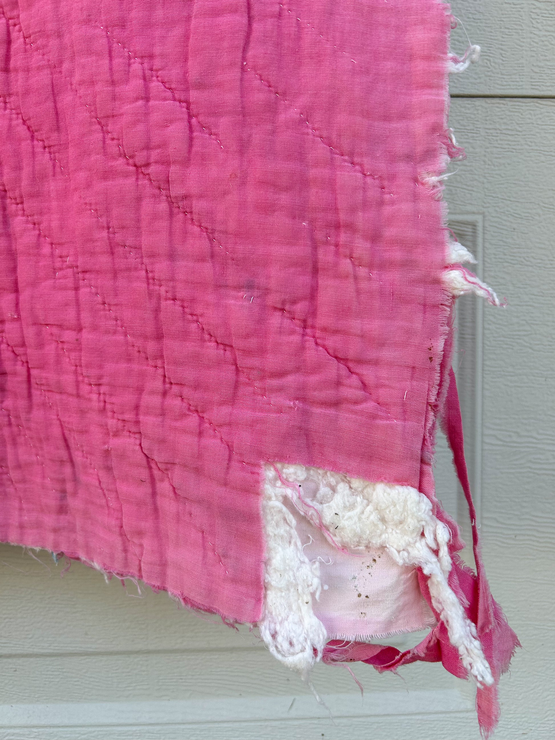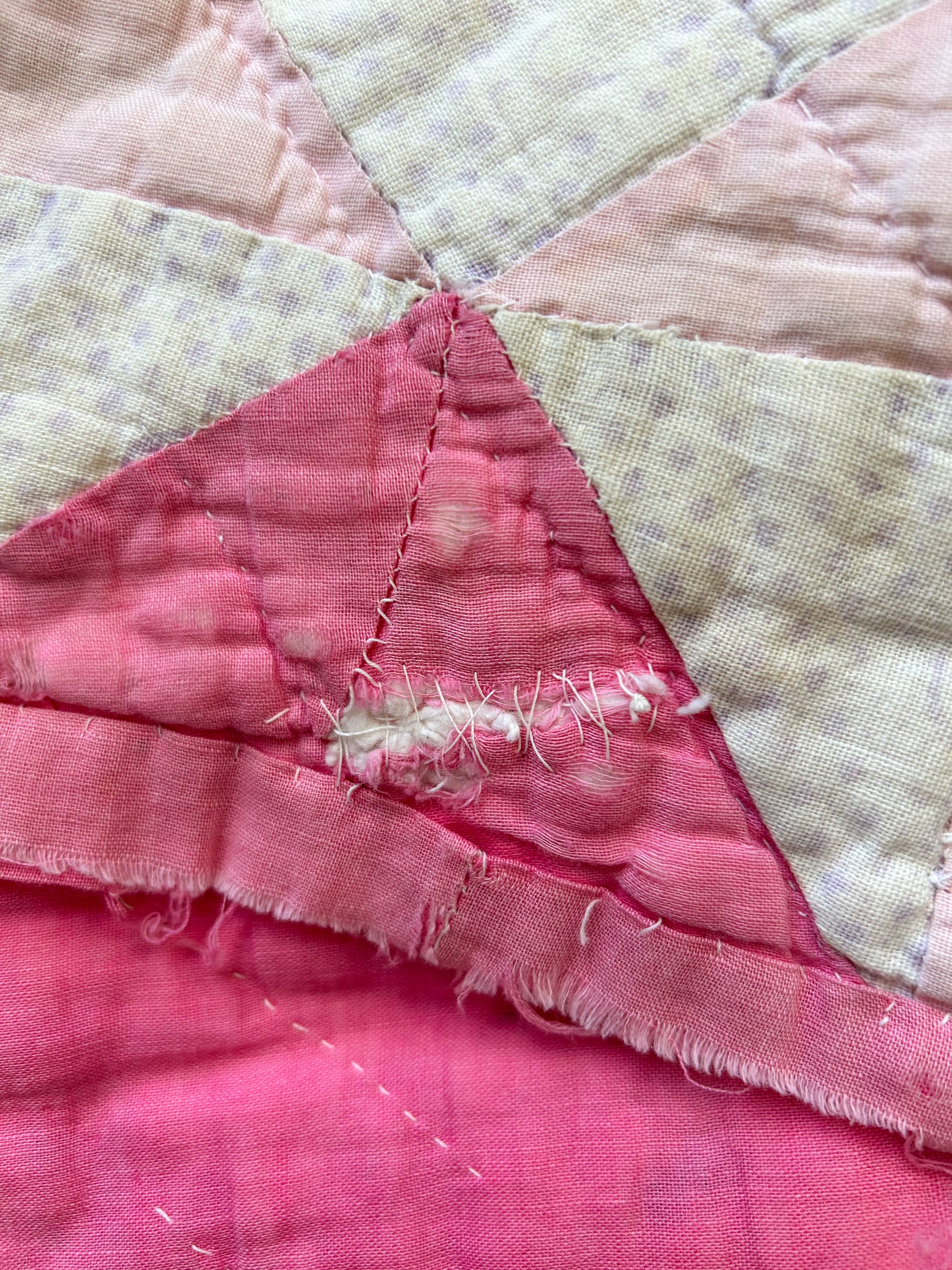 This quilt is probably best suited as a cutter quilt, or if you don't mind the condition issues, it would make a nice stacking quilt. The center of the quilt is intact, but it shows significant wear along all edges.