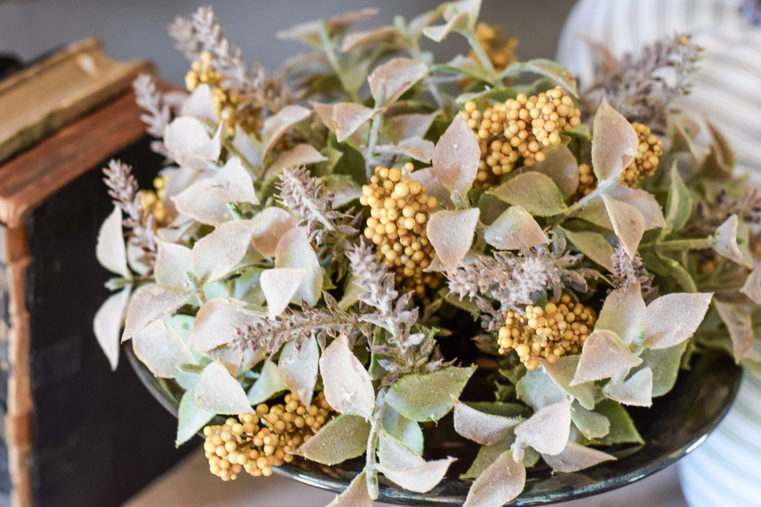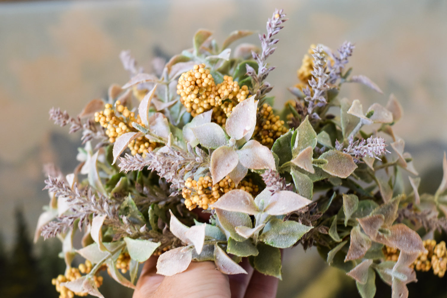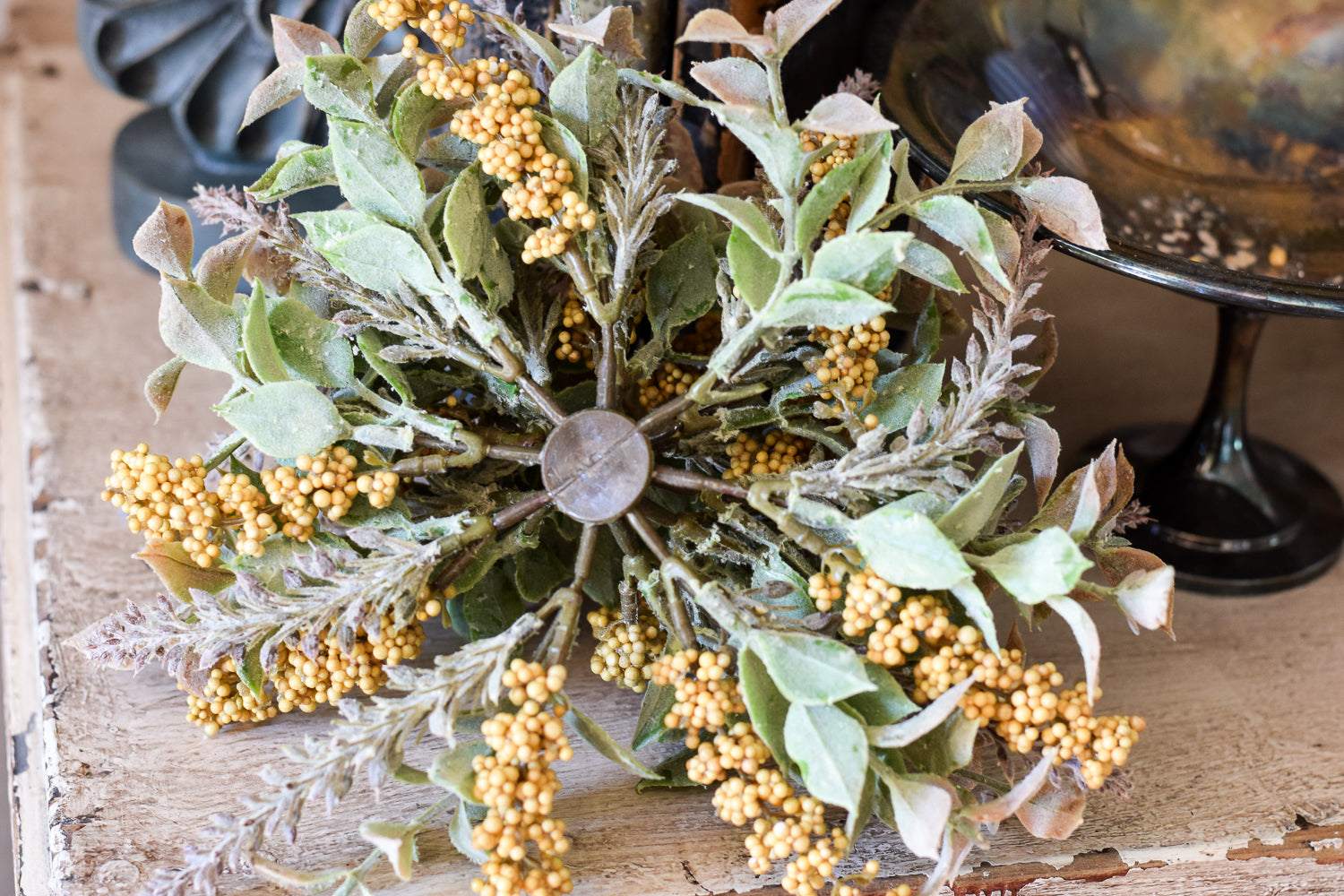 The Mustard Autumn Herbs Half Sphere has a crisp and cool feel, with spires of bubble berries and shoots tucked into leaves with a felted effect.