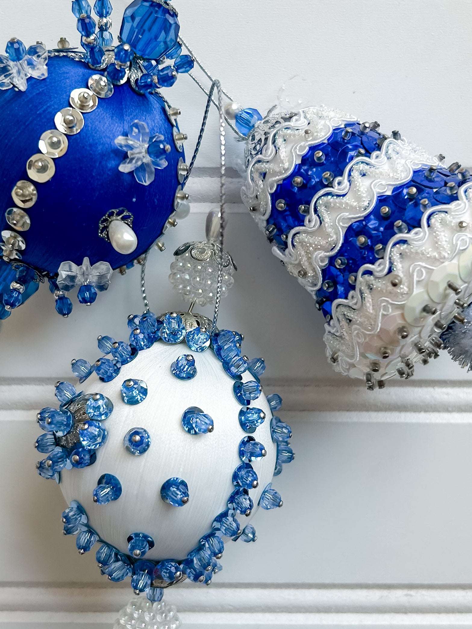 These stunning ornaments were likely made during the late 1960s or 1970s. They are in very good condition; it appears only the dark blue ornament might be missing 1 bead. Otherwise, they are in perfect shape!