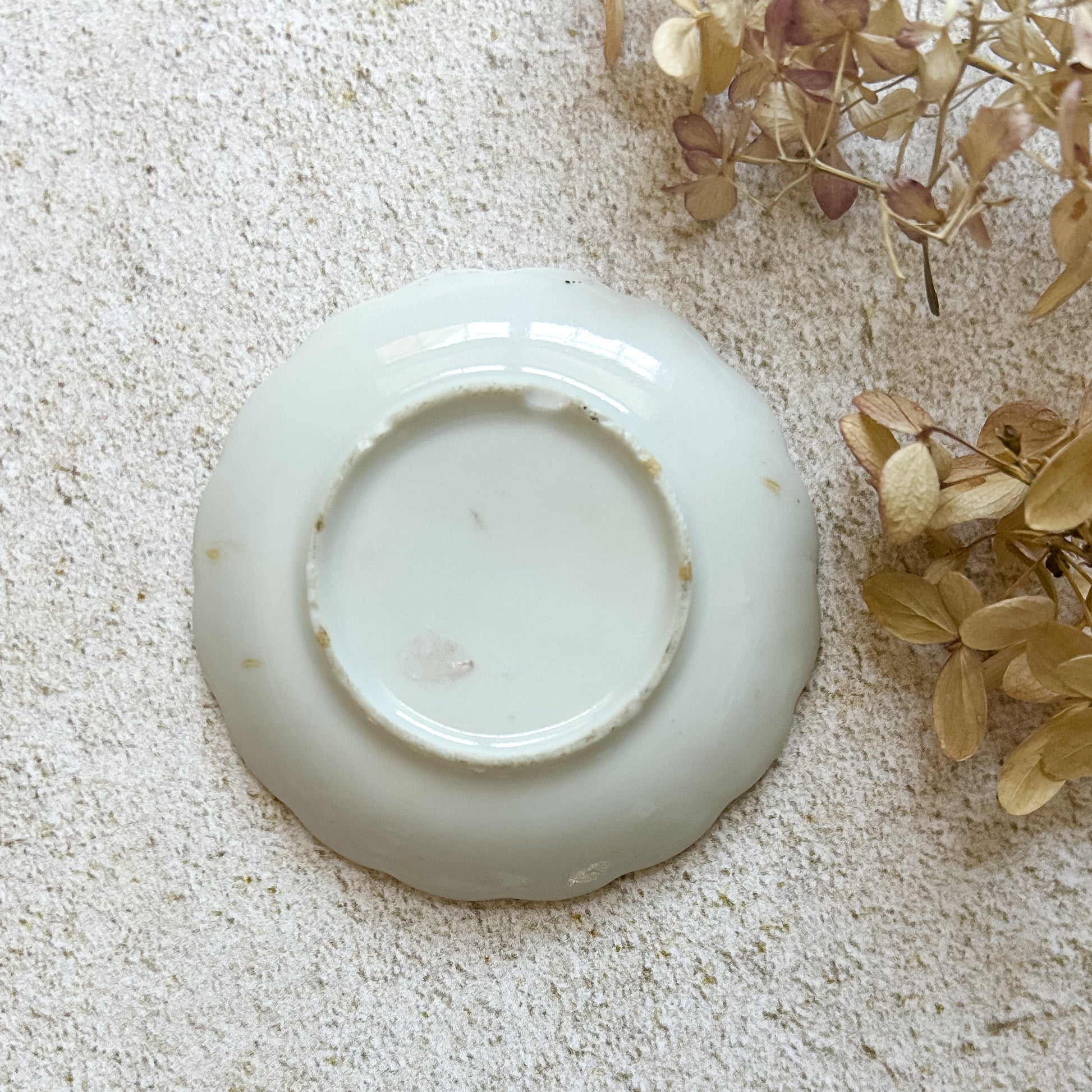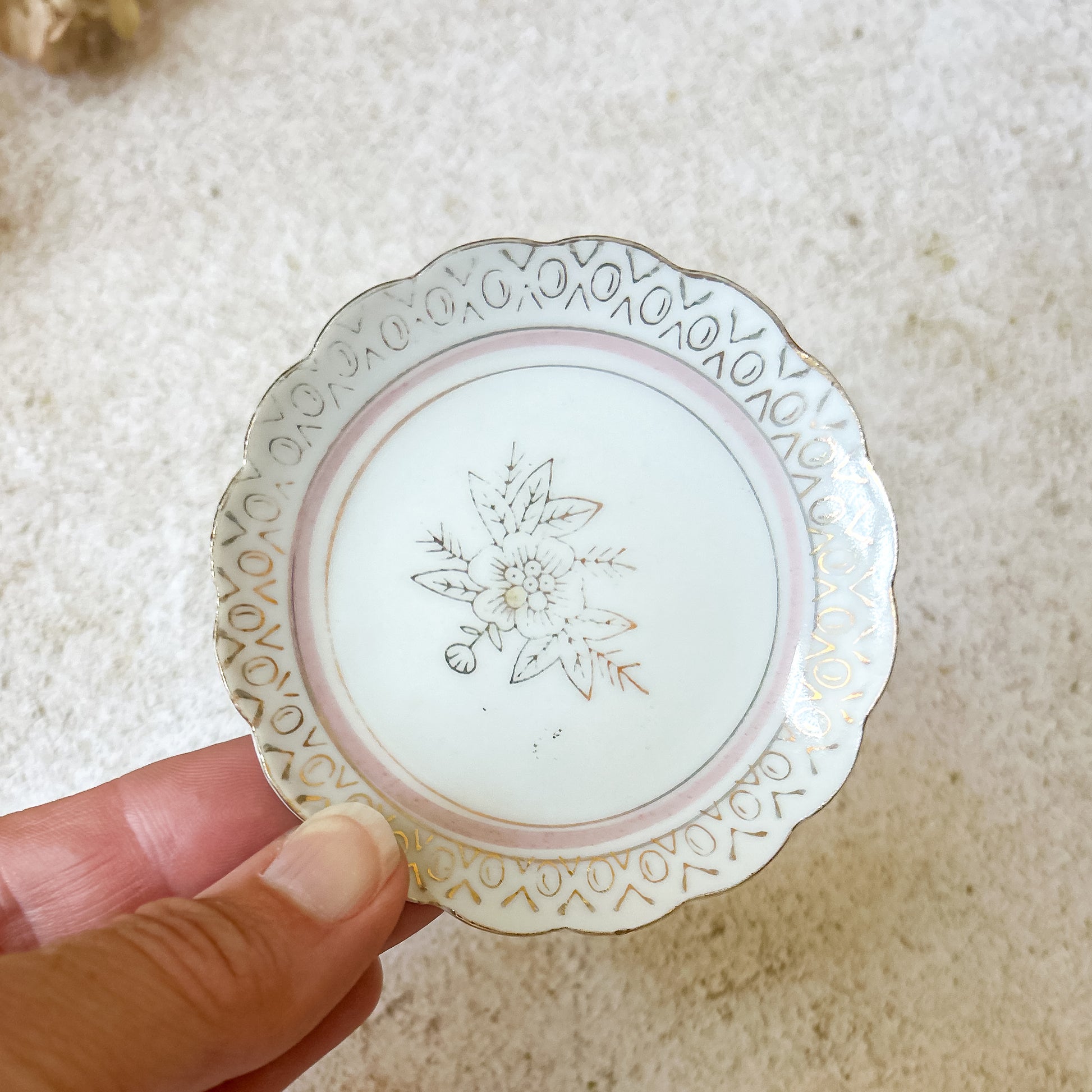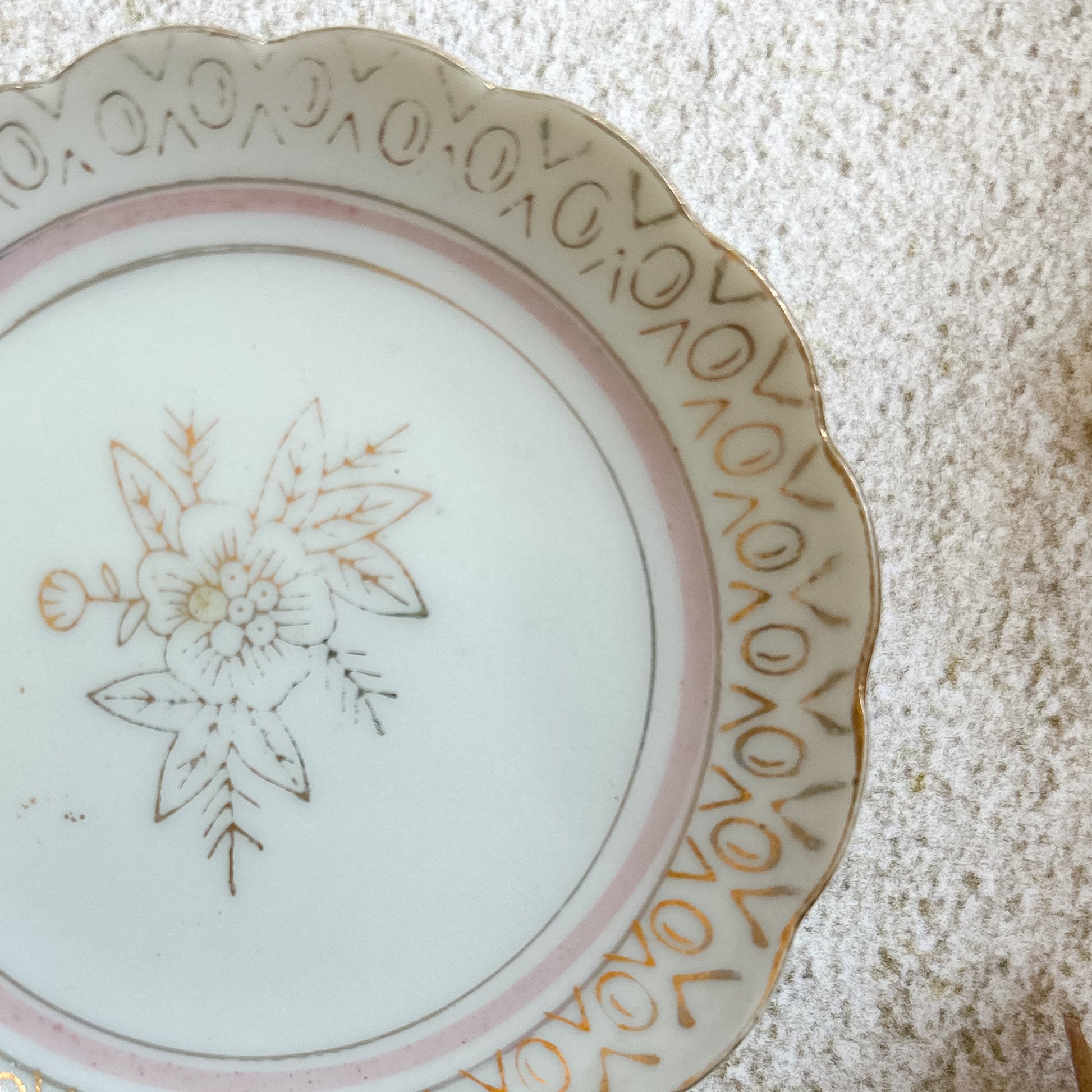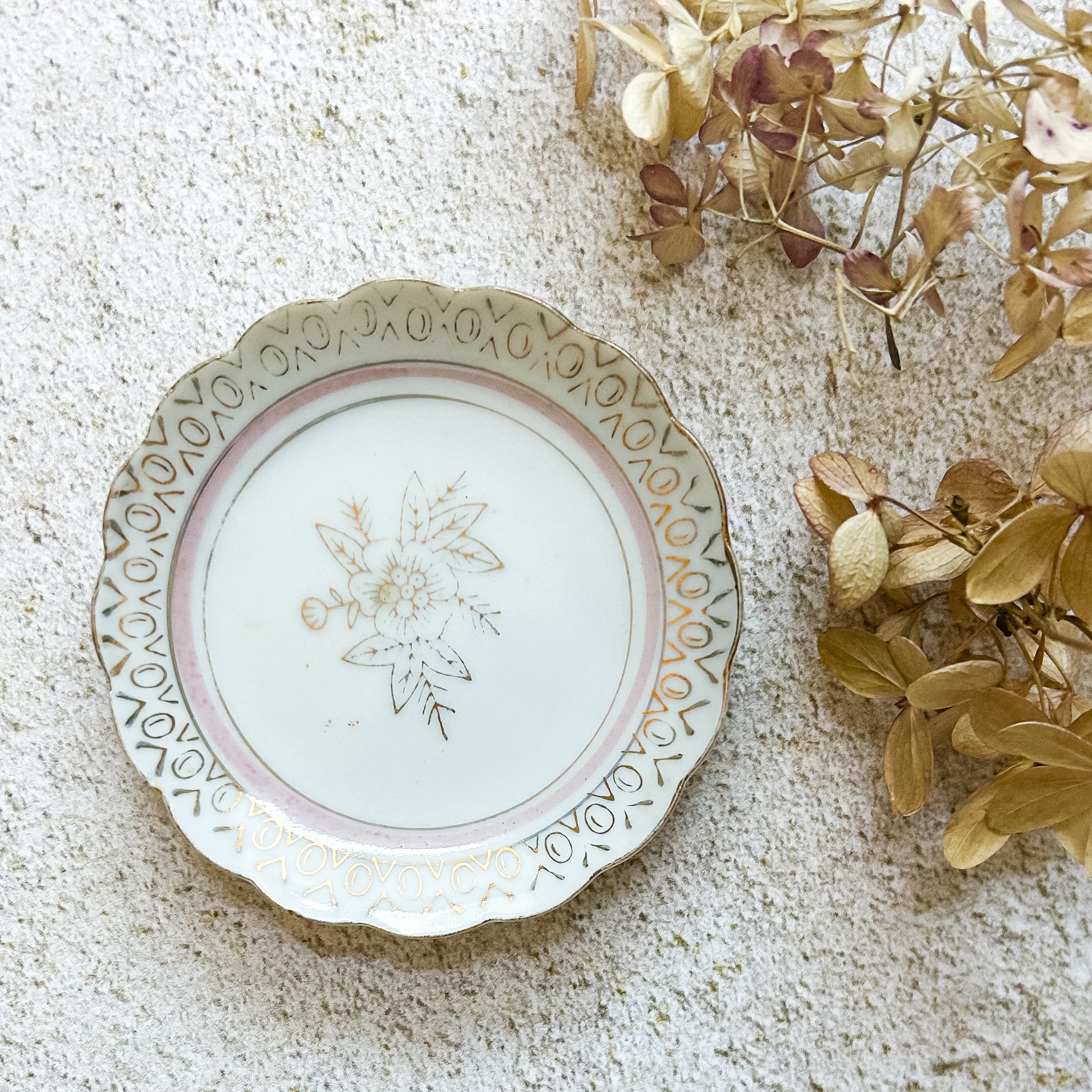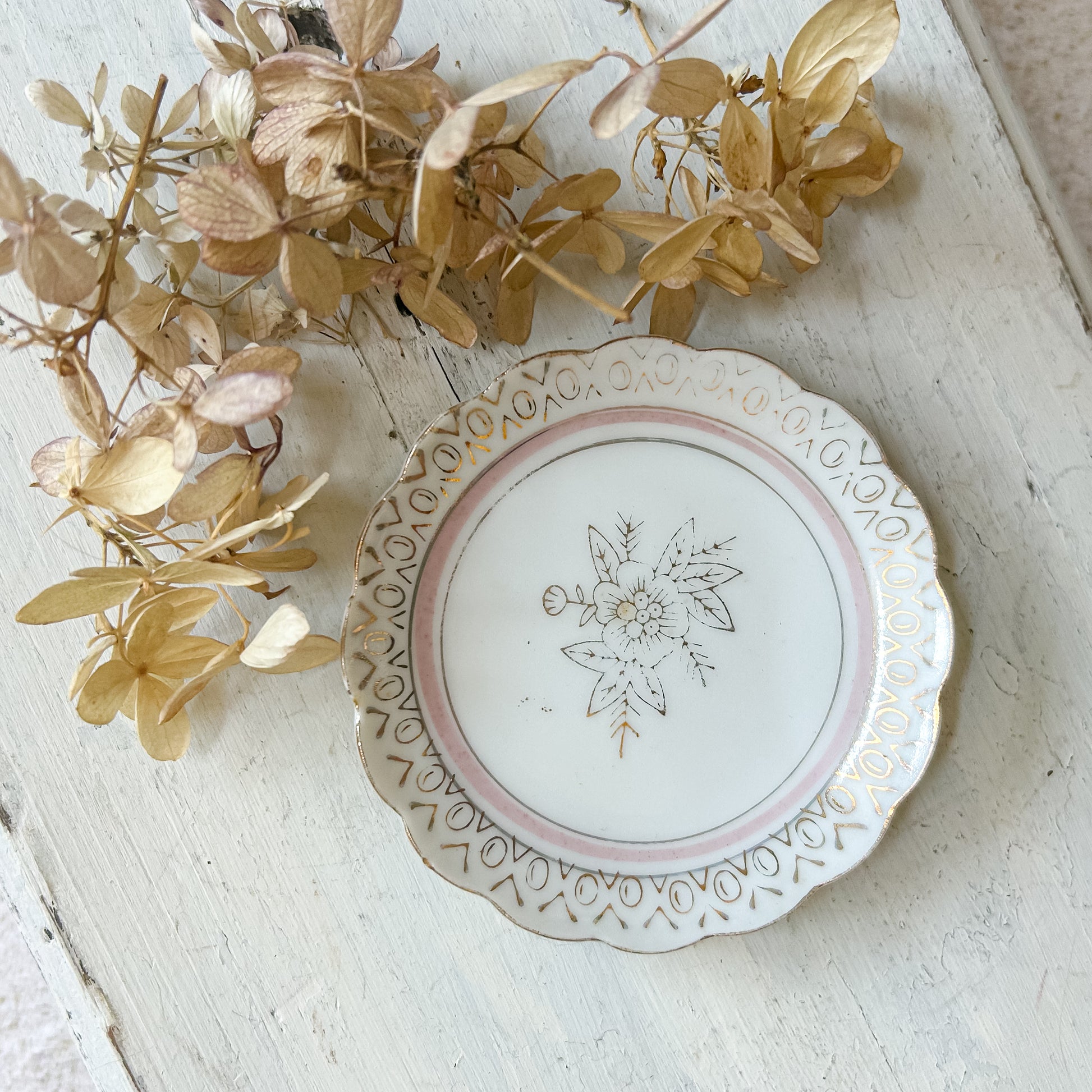 Unmarked butter pat with a light pink and gold pattern. Overall good condition, with a little bit of wear on the front of the gold edging, and one small chip along the backside base.