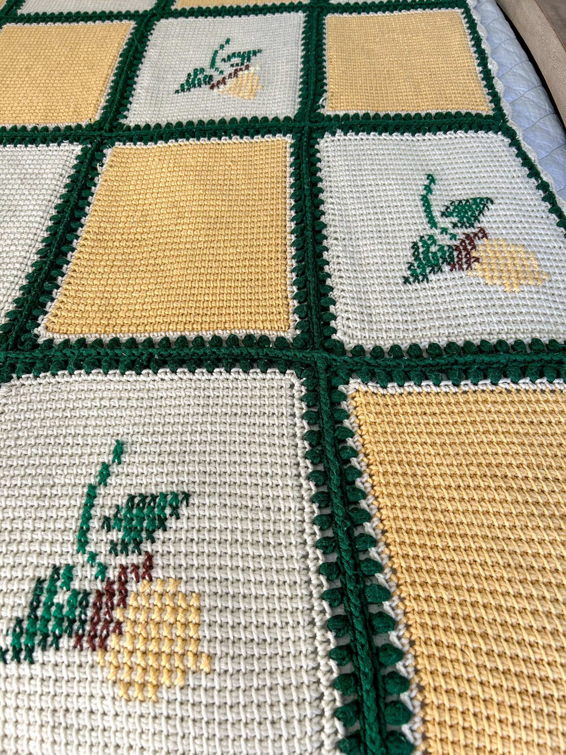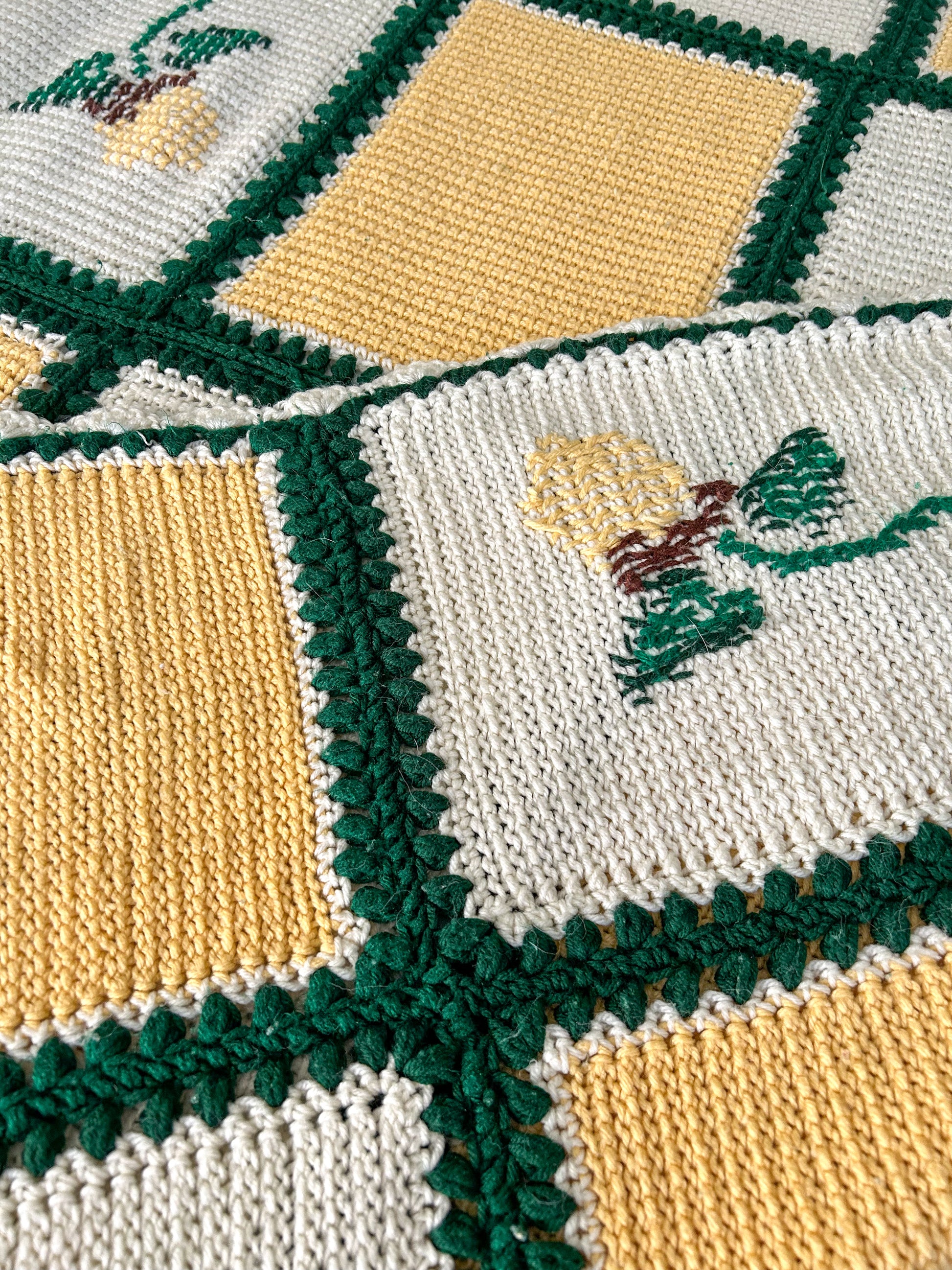This soft, snuggly afghan has the look of a quilt with the texture of a blanket. Featuring buttery yellow and creamy white squares, accented with a stitched yellow tulip and hunter green trim.