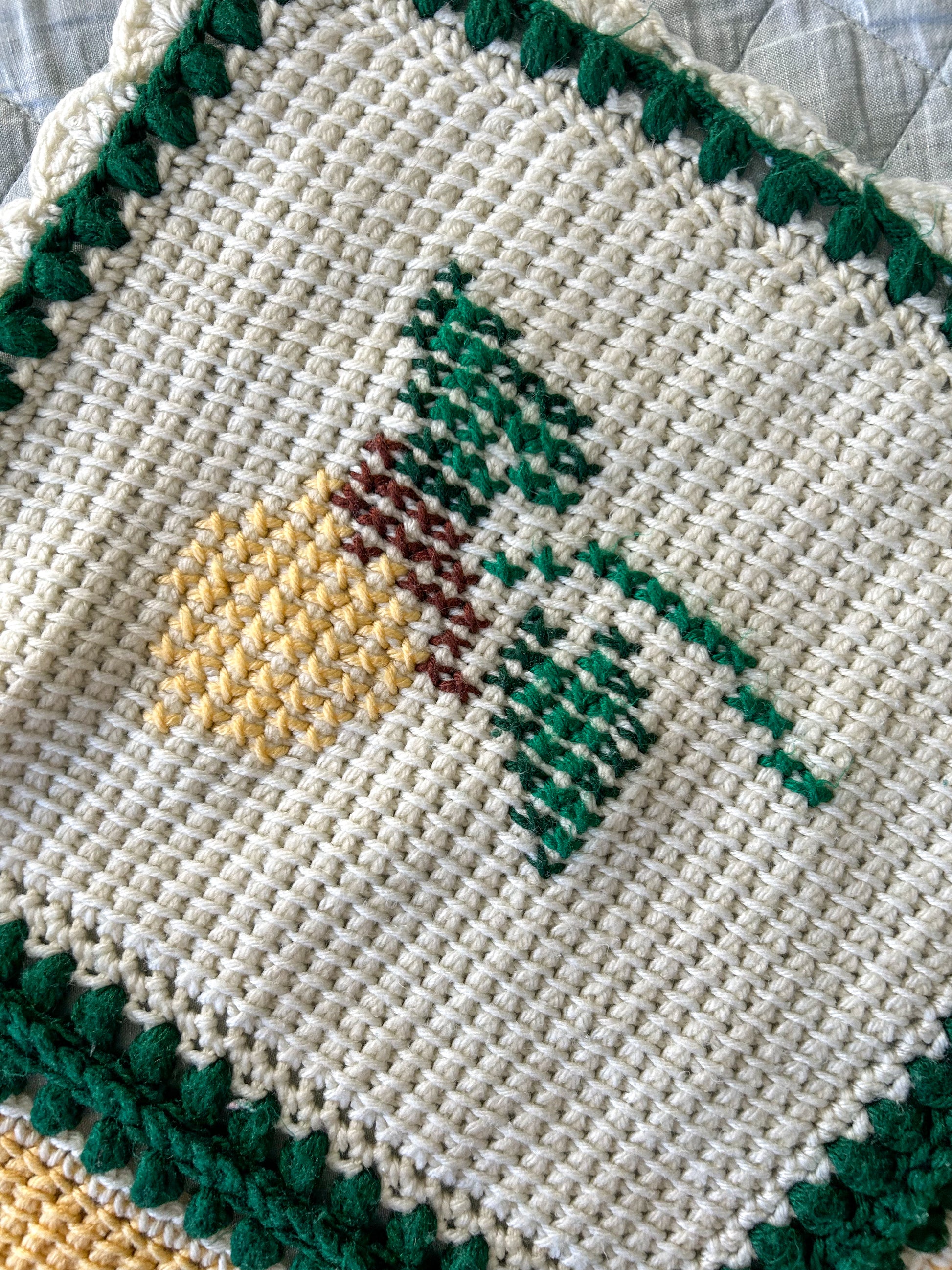 The afghan is in good vintage condition with no major holes or tears. The yarn is a bit fuzzy, and a few small pulls and tied-off yarn pieces are visible. It has not been washed but smells clean.