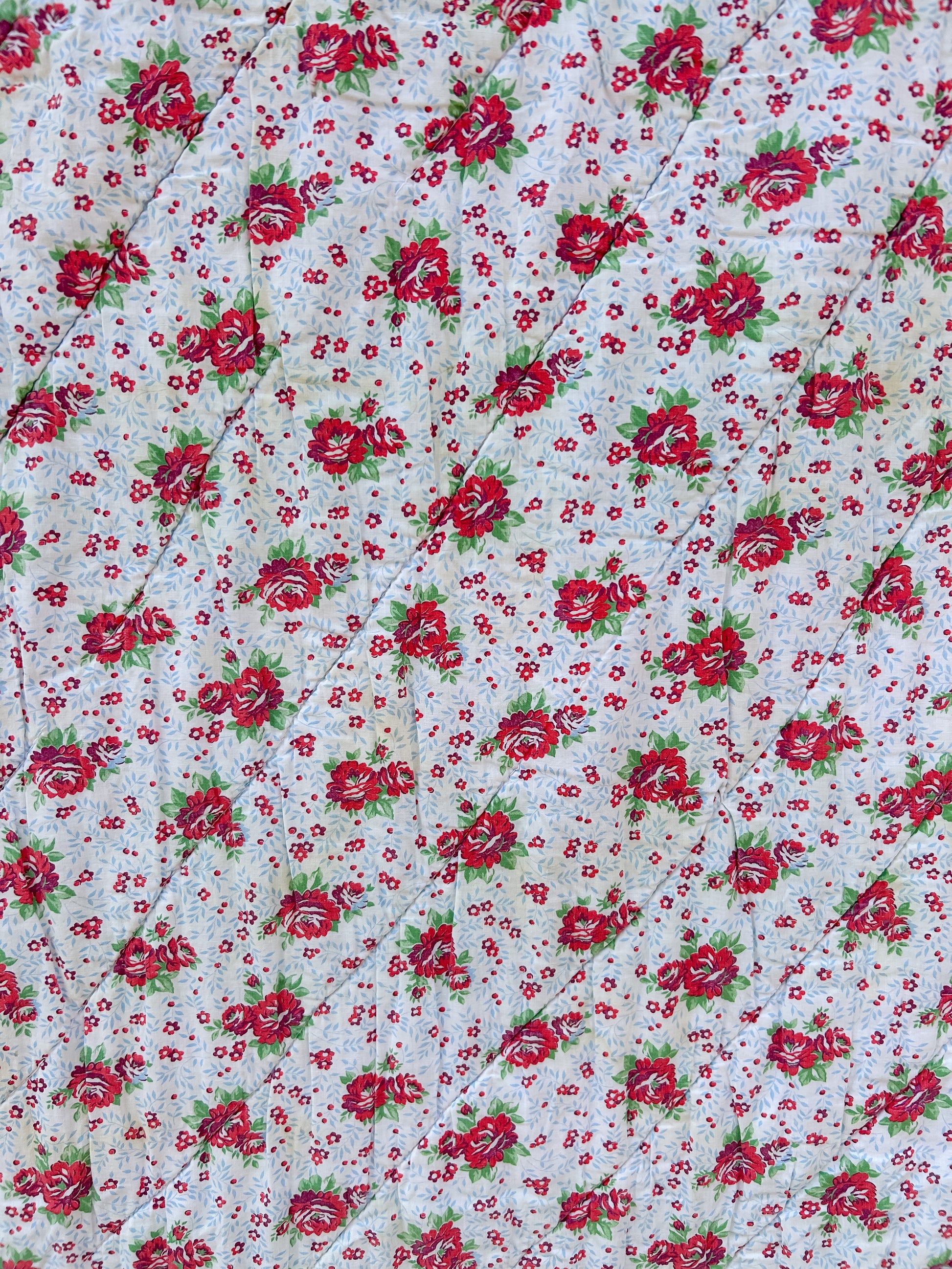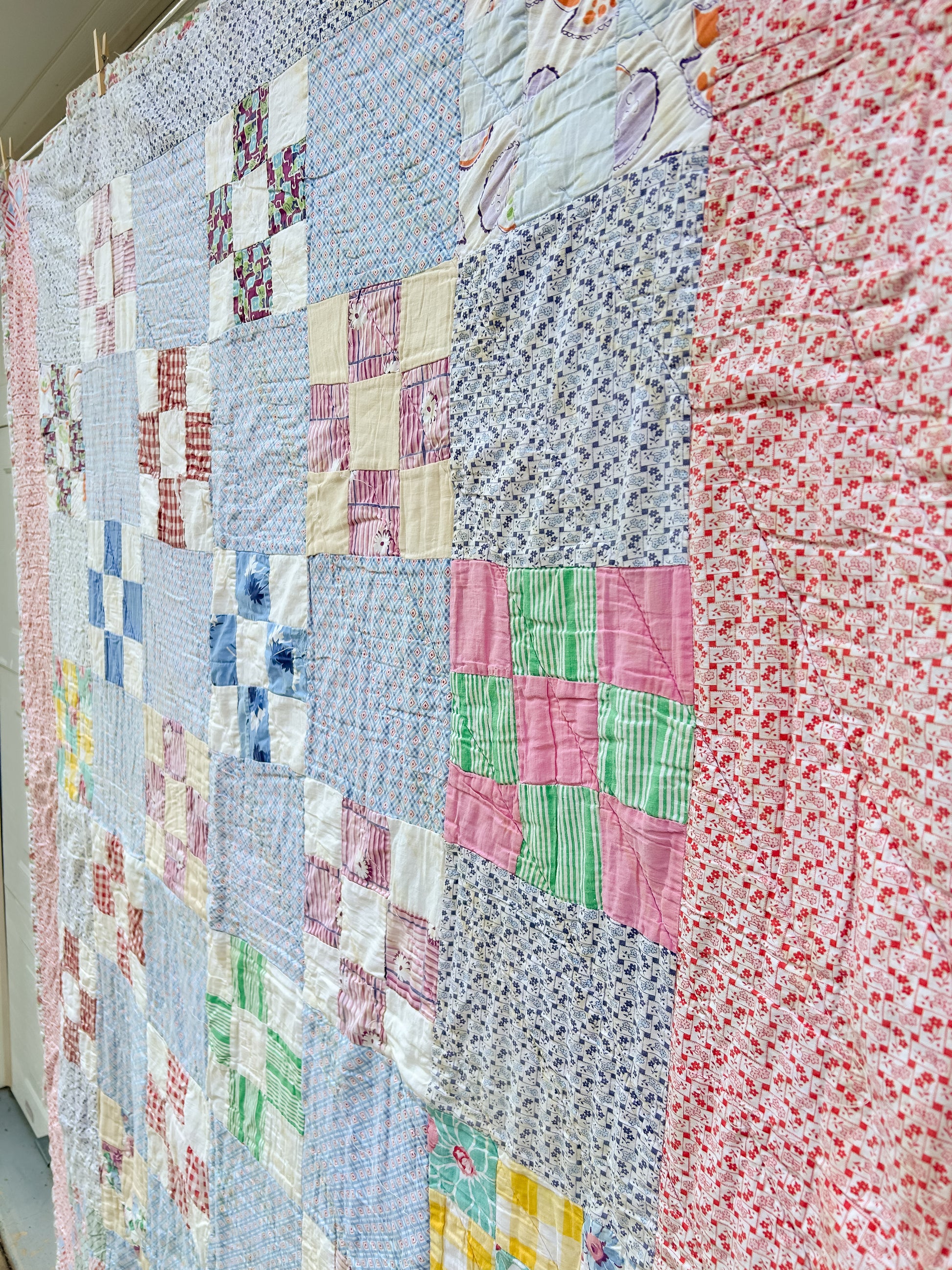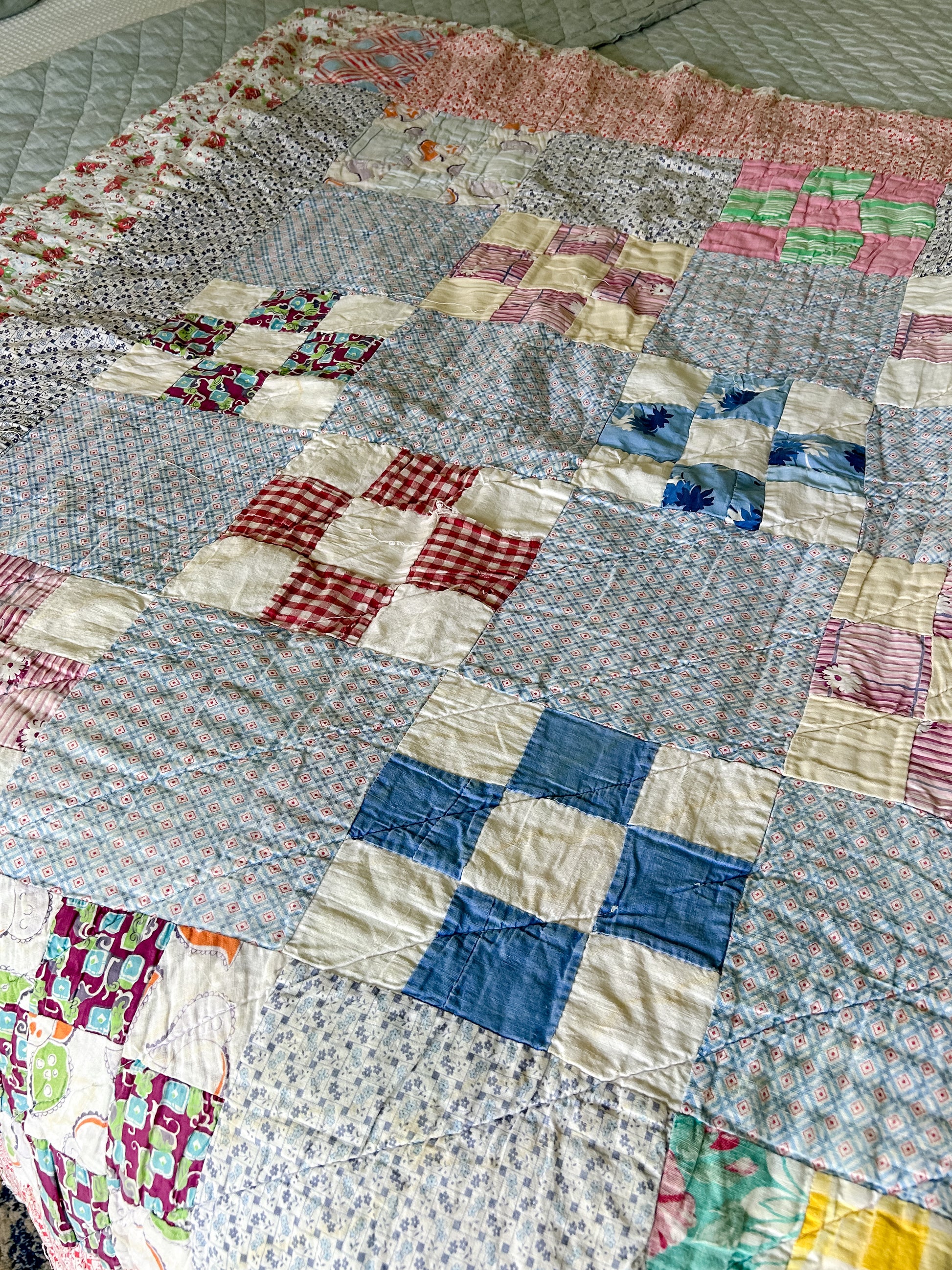 An adorable, light-weight quilt full of cottage charm! While this quilt does have condition issues, it's still packed with character and vibrant color.