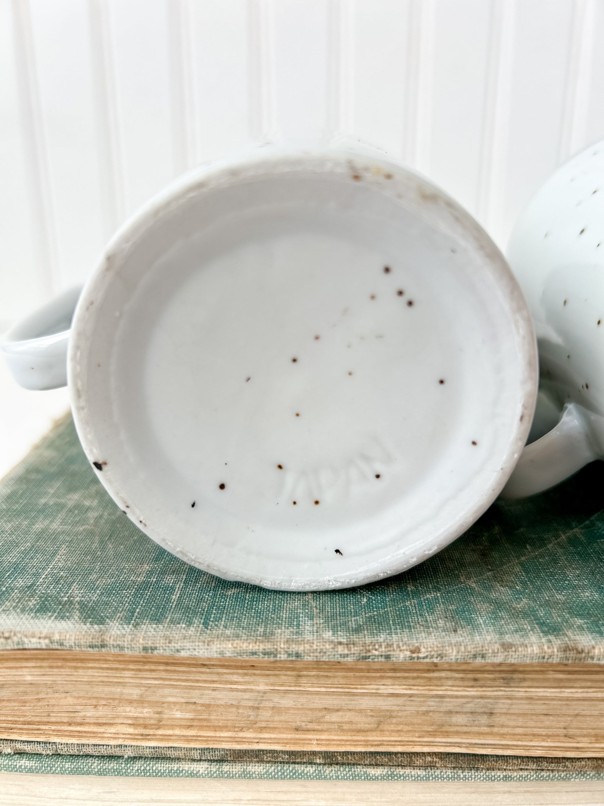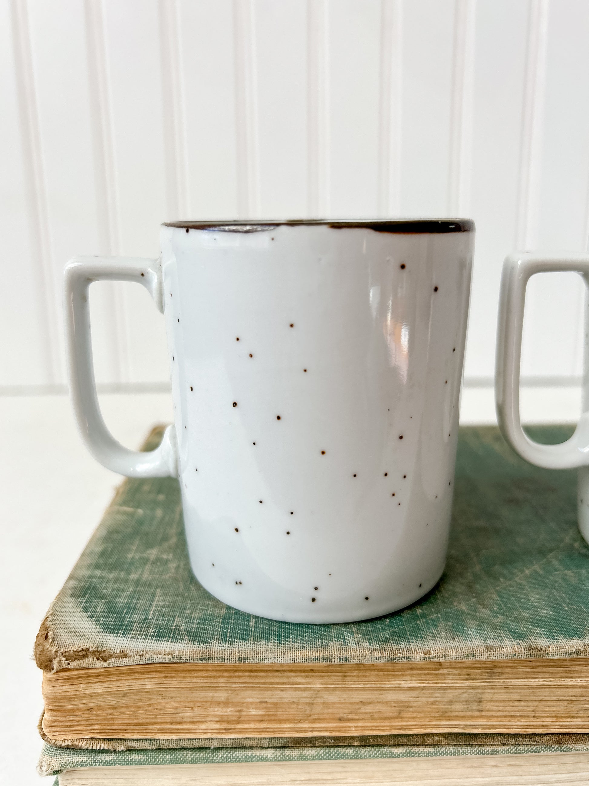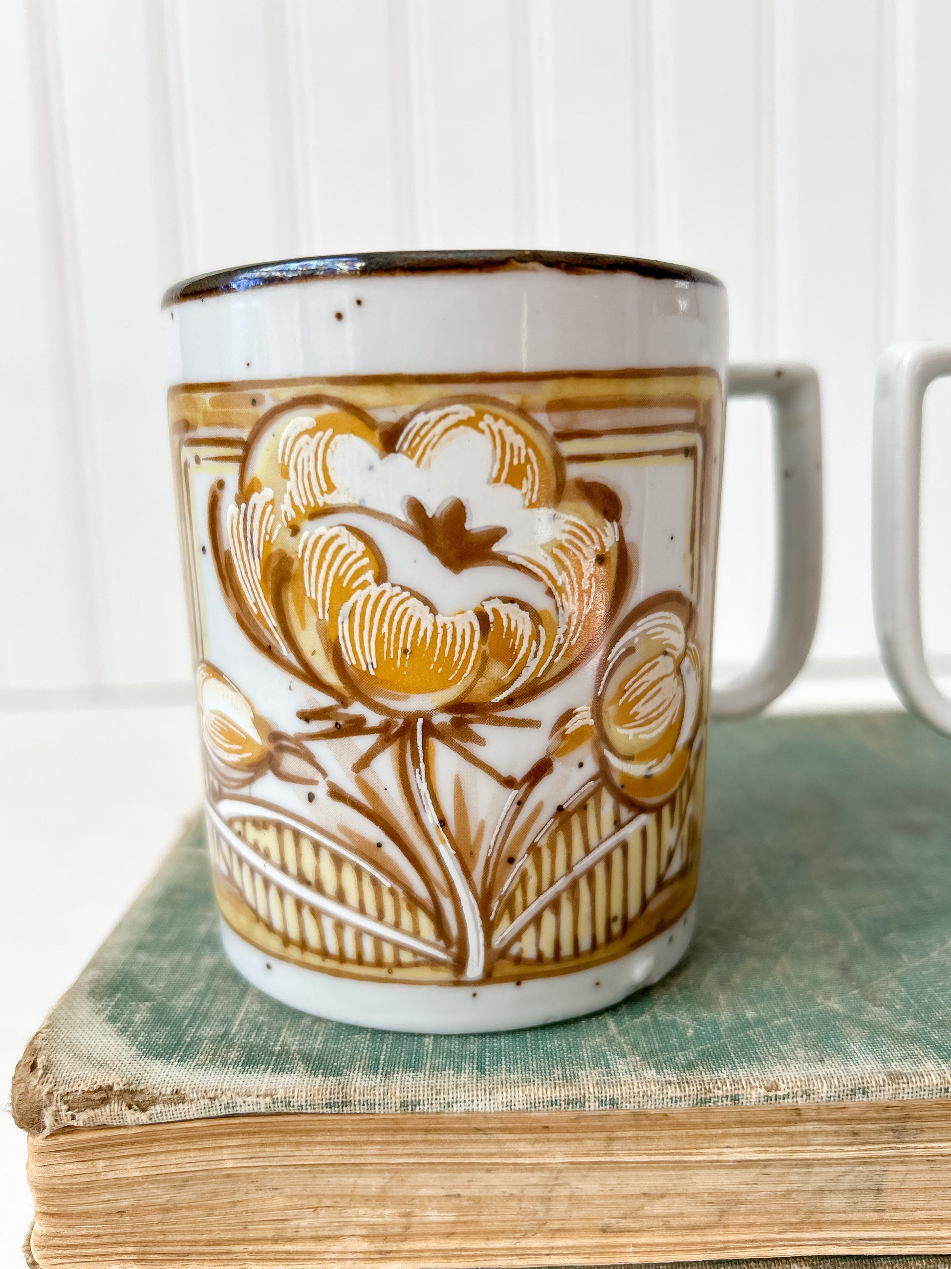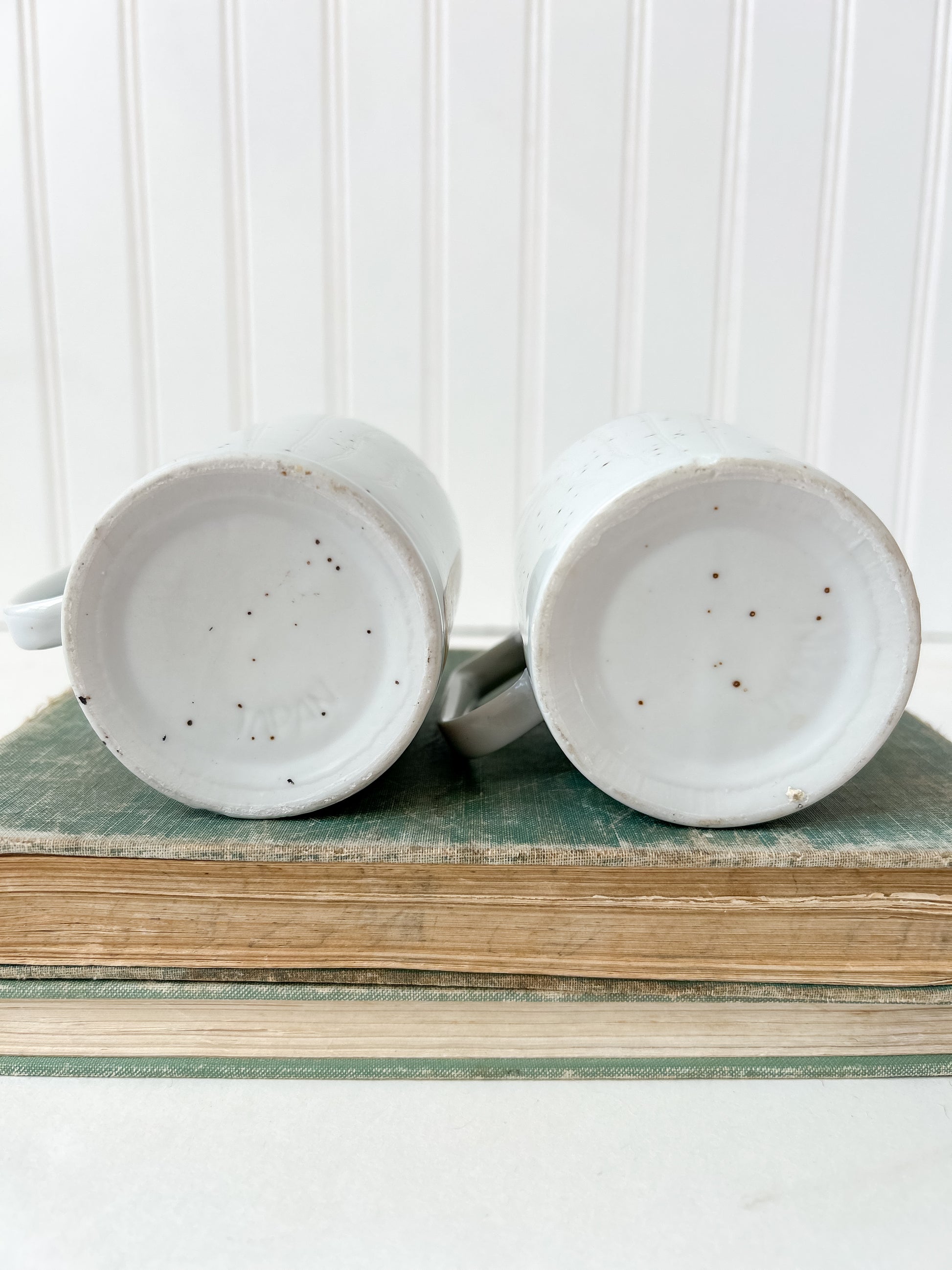 A lovely pair of vintage stonware mugs, with a funky mid-century floral pattern and spotted finish. These were made in Japan, and marked on the base. The mugs are both in good condition and measure approximately 3" tall. One mug has a small chip on the base, as shown in the last photo.