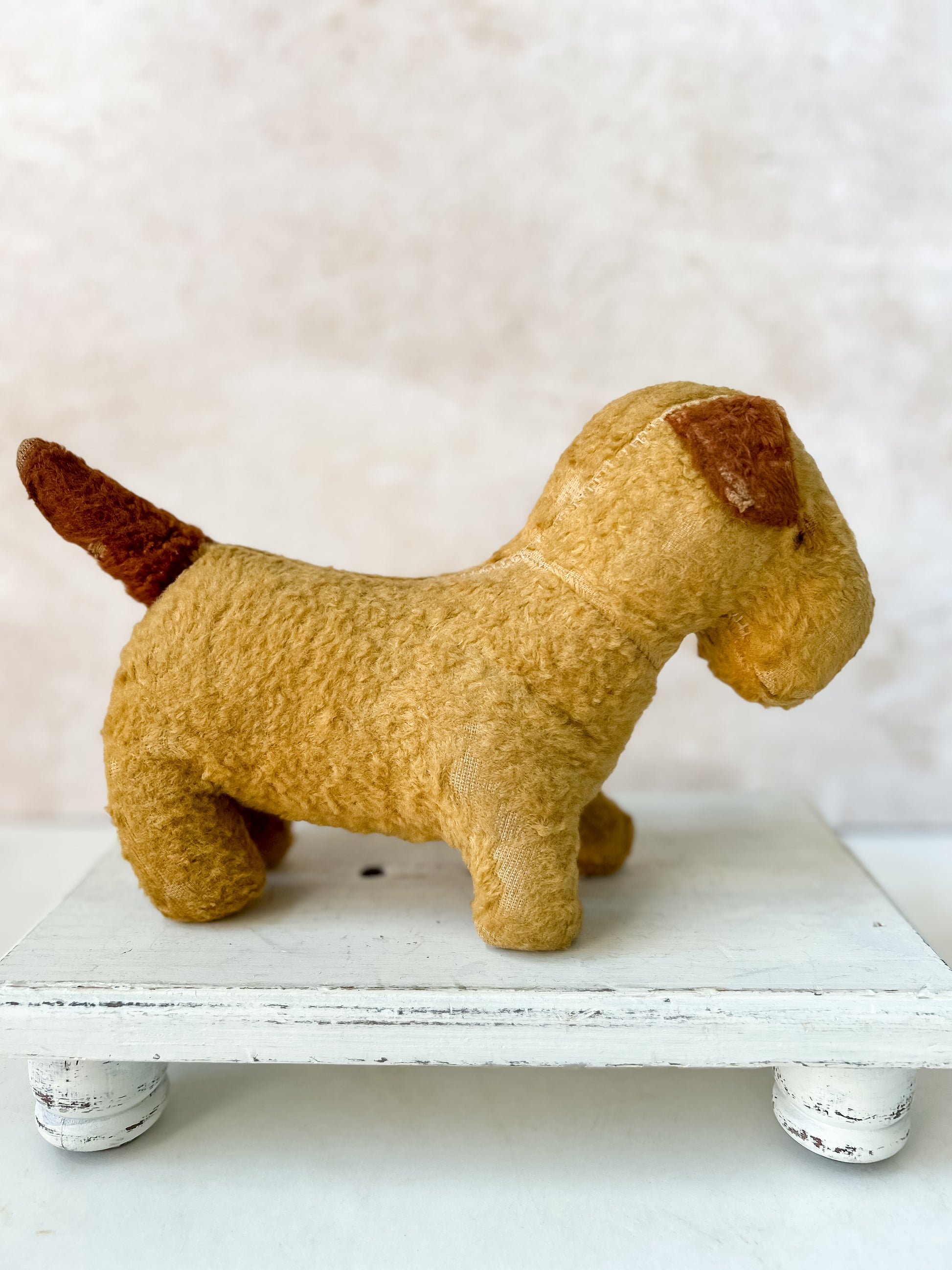 An adorable vintage stuffy! He's a cute little terrier dog with button eyes and a stitched nose. He has metal stitches on the underside of his ears, which likely originally tacked them down. His fur is worn in some spots, but all his stitching is sound. He does not have a tag. He is also missing one eye. He measures 7" tall and 10" nose to tail.